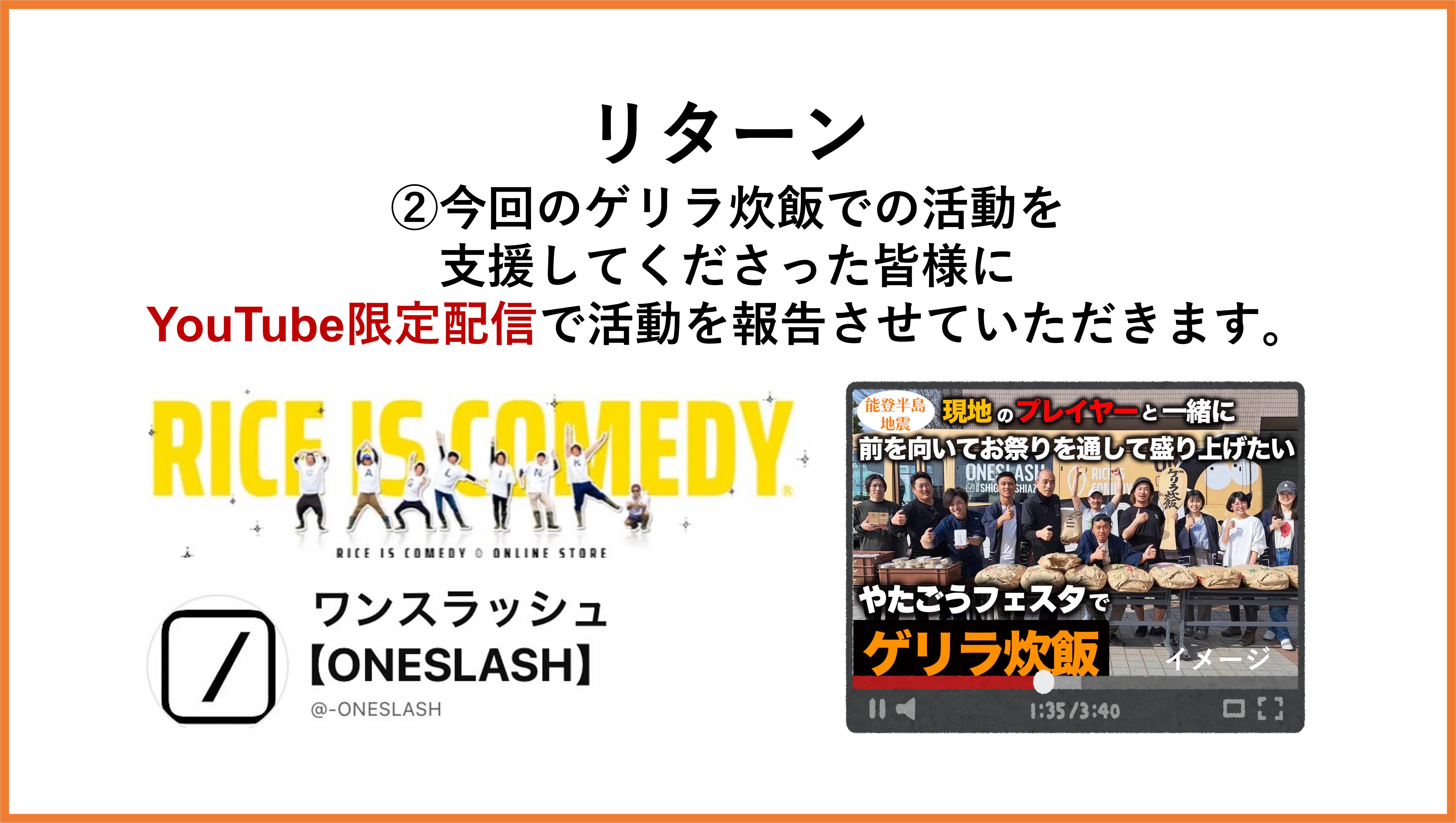 ②「支援してくださった皆様にYouTube限定配信で活動を報告とさせていただきます。」