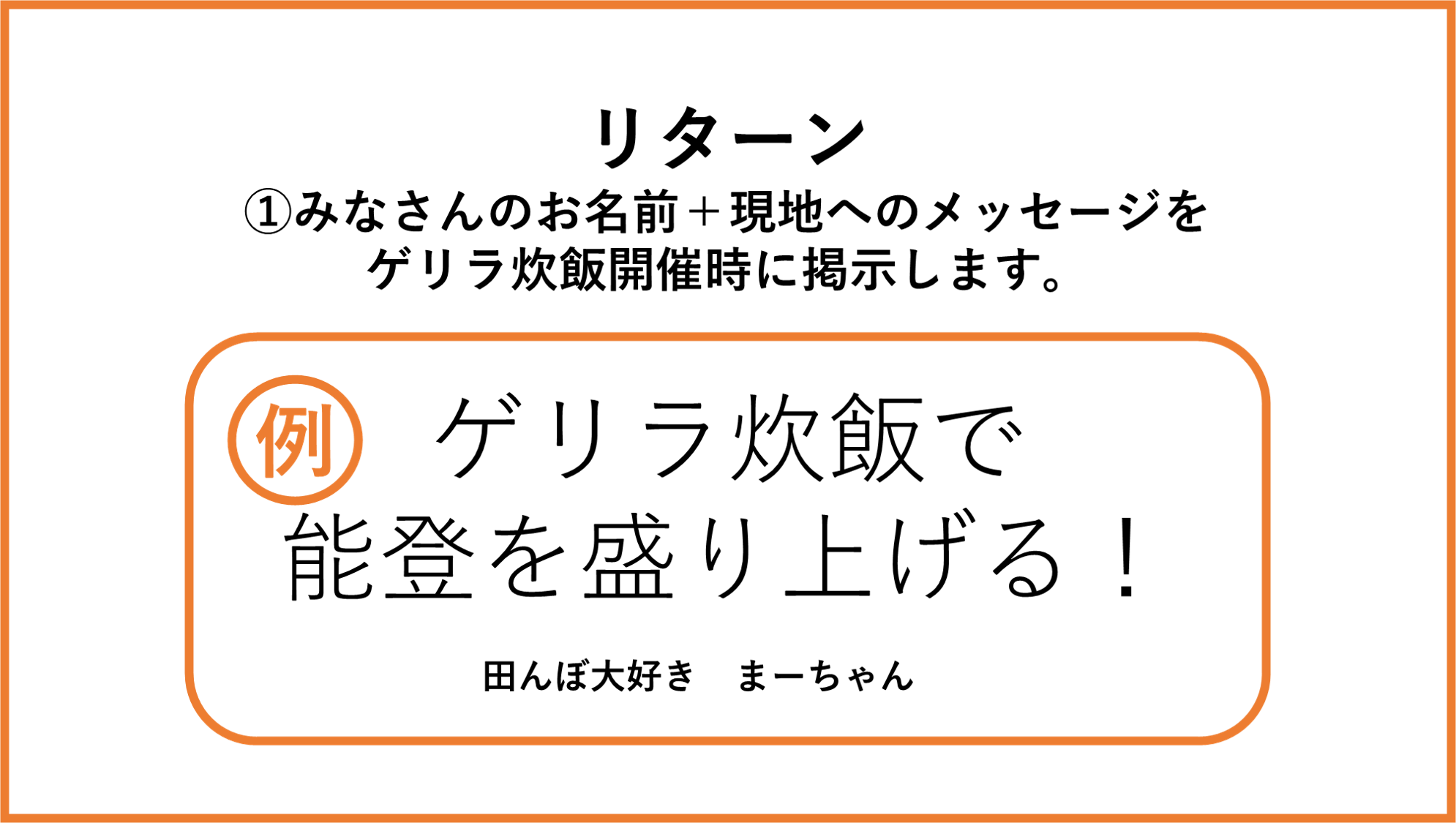 ①「お名前+現地へのメッセージをゲリラ炊飯開催時に掲示」