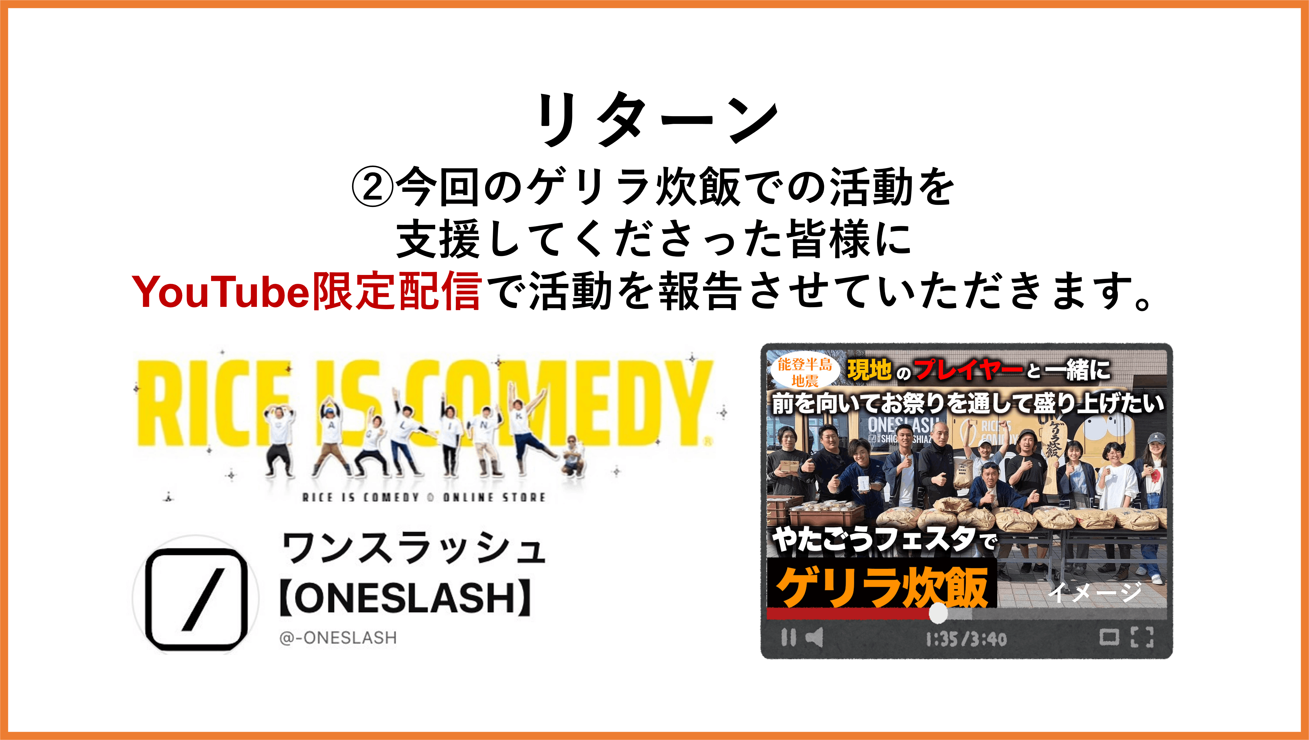 ②「支援してくださった皆様にYouTube限定配信で活動を報告とさせていただきます。」