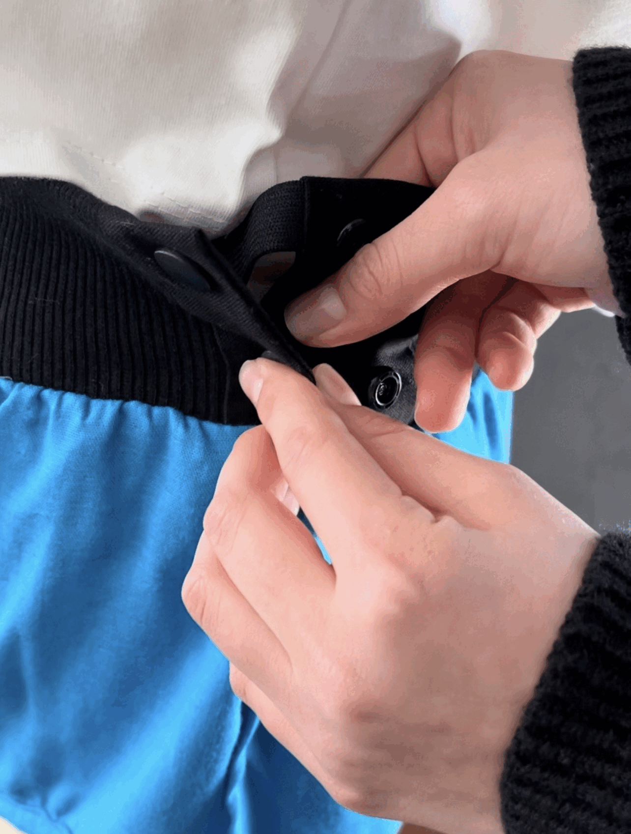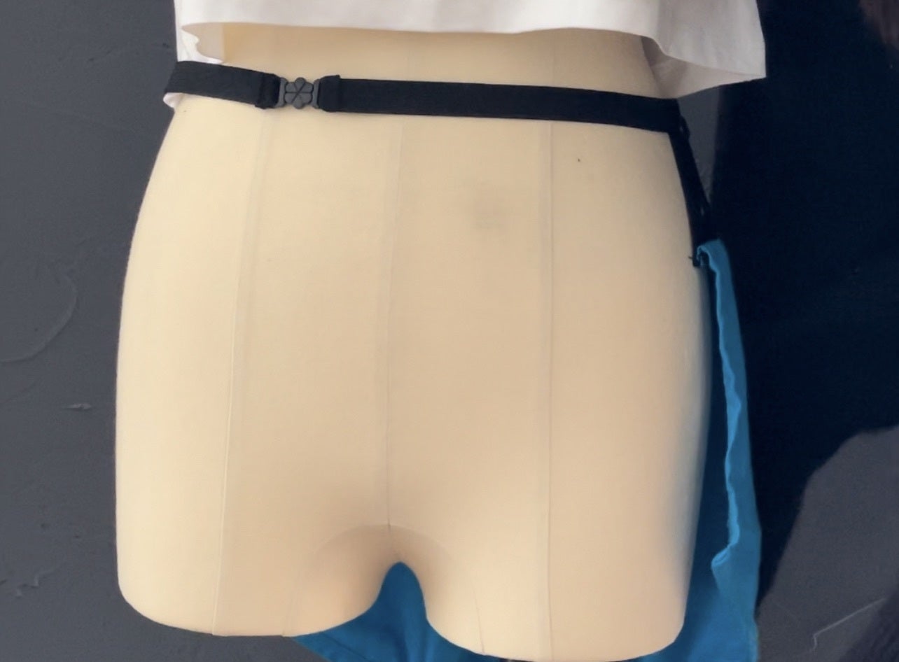 完成品はウエストのゴムにプラスチックホックがついていますが、最初はヒモで結んで固定していました。またボタンの部分は、手の不自由な方や力の弱い方でも簡単に着けられるように、面ファスナー(マジックテープ、(株)クラレの商標)を採用していました。しかし、ヒモでは伸び縮みせずパンツのように上げ下げがしづらいこと、面ファスナーでは糸くずなどが入りこんだり摩耗して劣化しやすいことや、不意に肌に当たった時にチクチク痛いことなどから採用を諦め、今の仕様に変更しました。この決断をするのにも迷って悩んで数ヶ月かかりました。