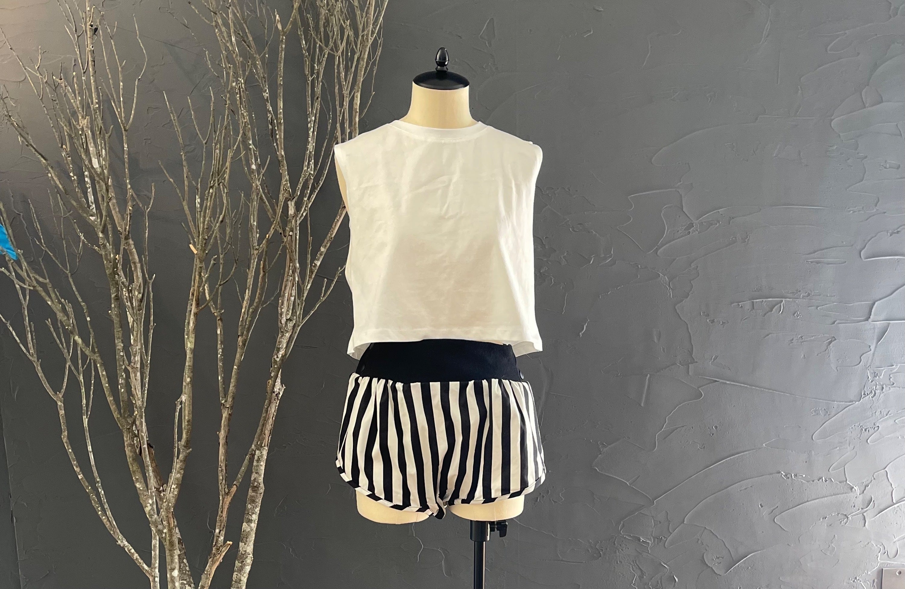 今回ガーゼ生地に混じって白黒ストライプ生地のパンツも含まれていますが、あの生地は開発スタッフ、関係者の間の一番人気の柄で、実は私も一番気に入っています。気分が上がるストライプはうちの定番商品です。