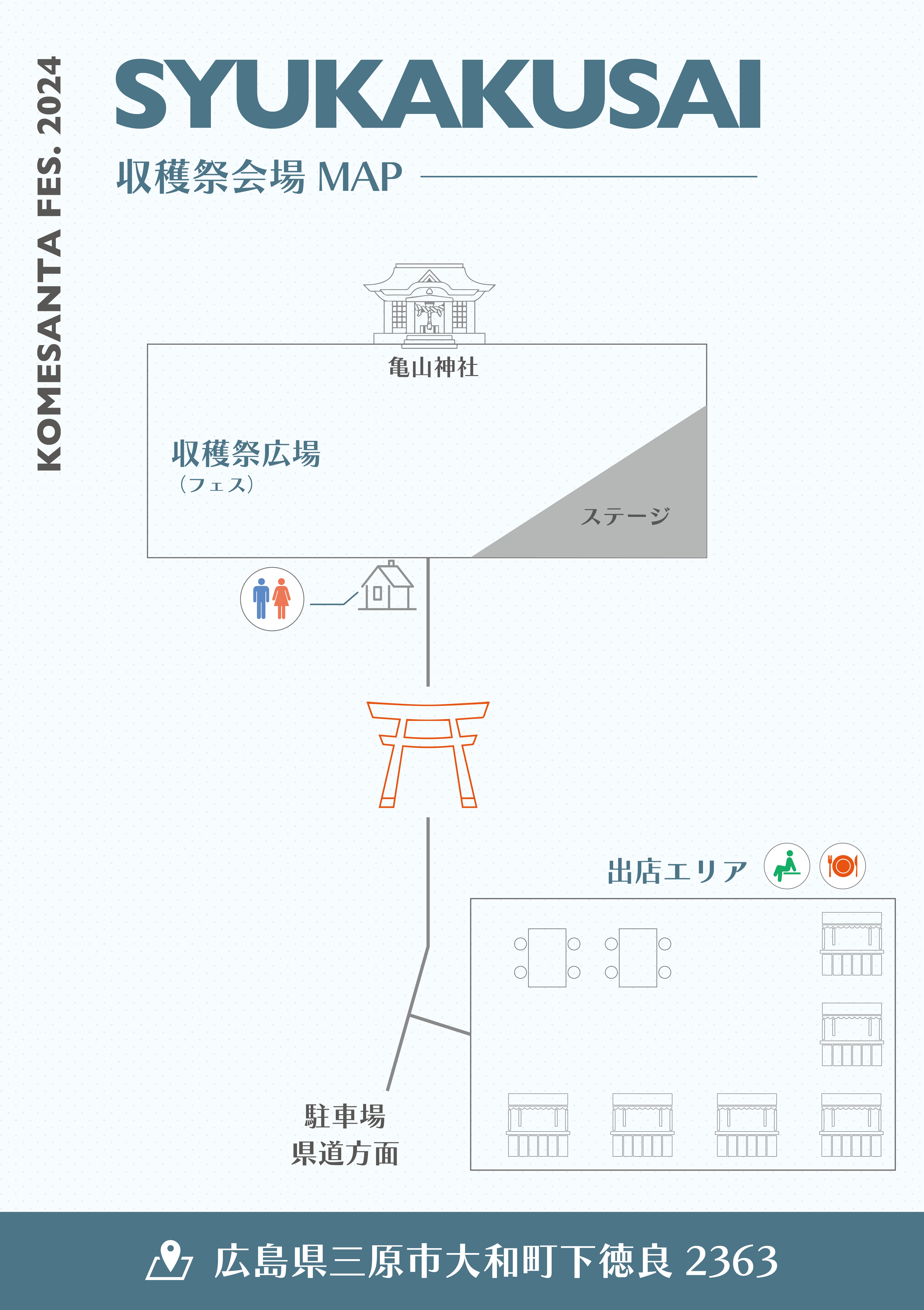 ※稲刈り会場、お祭り会場(亀山神社)、には隣接する駐車場はございません。