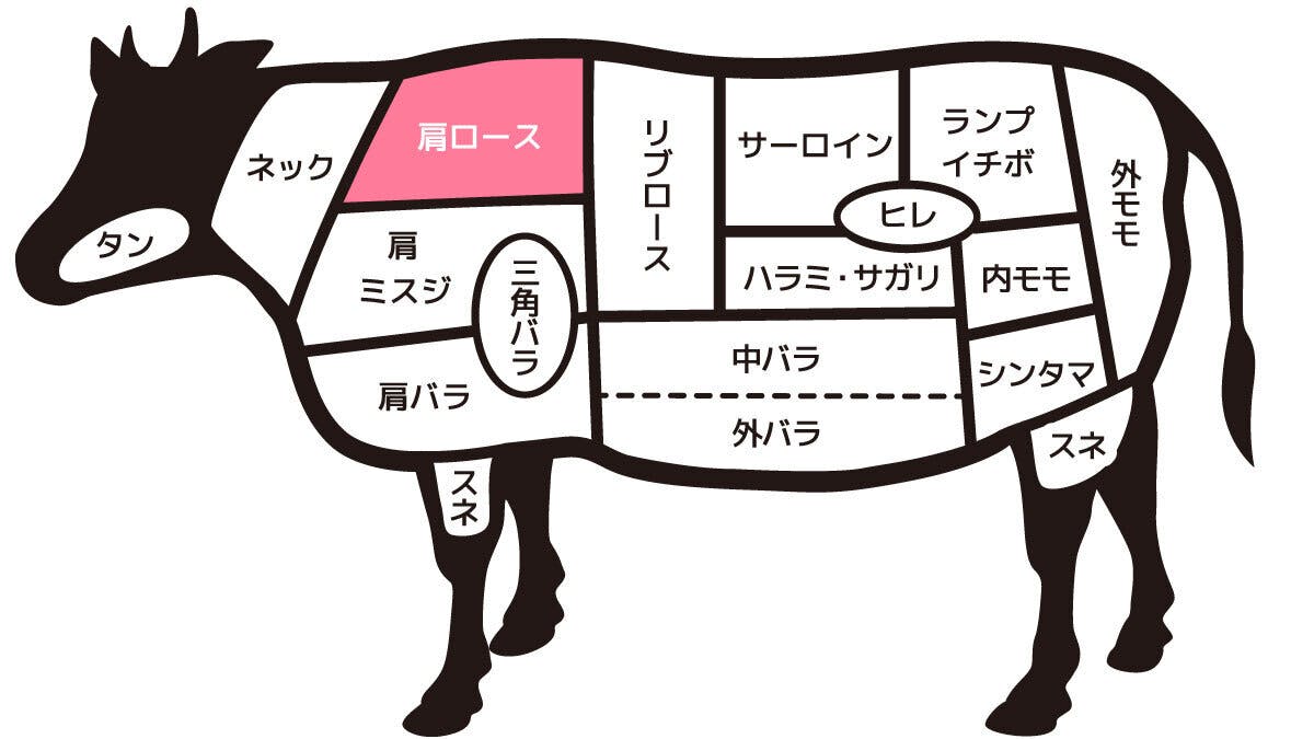 肩ロースは適度に脂肪を含み、柔らかく、赤身の旨味が濃いのが特徴です。肩から背中にかけての頭に近い部分で比較的動かす部位なので、ほどよい食感と濃厚な味を楽しめます。 すき焼きやしゃぶしゃぶのような、薄切りにして食べるメニューや焼肉がおすすめの食べ方の部位となります。
