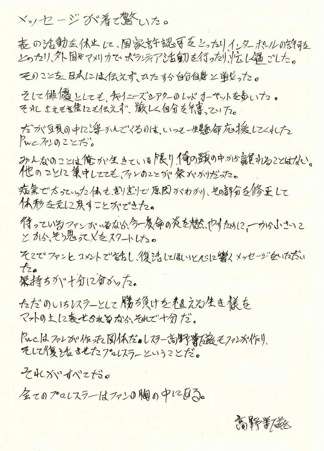 「あの頃に応援してくれていたプロレスファンが協力してくれるなら、こんなに嬉しいことはないよ。俺と一緒に夢の続きを見ようぜ!」