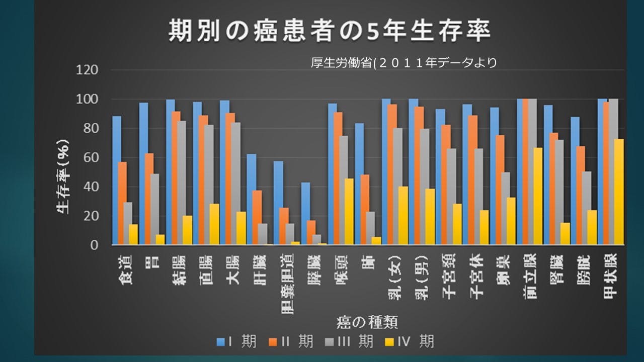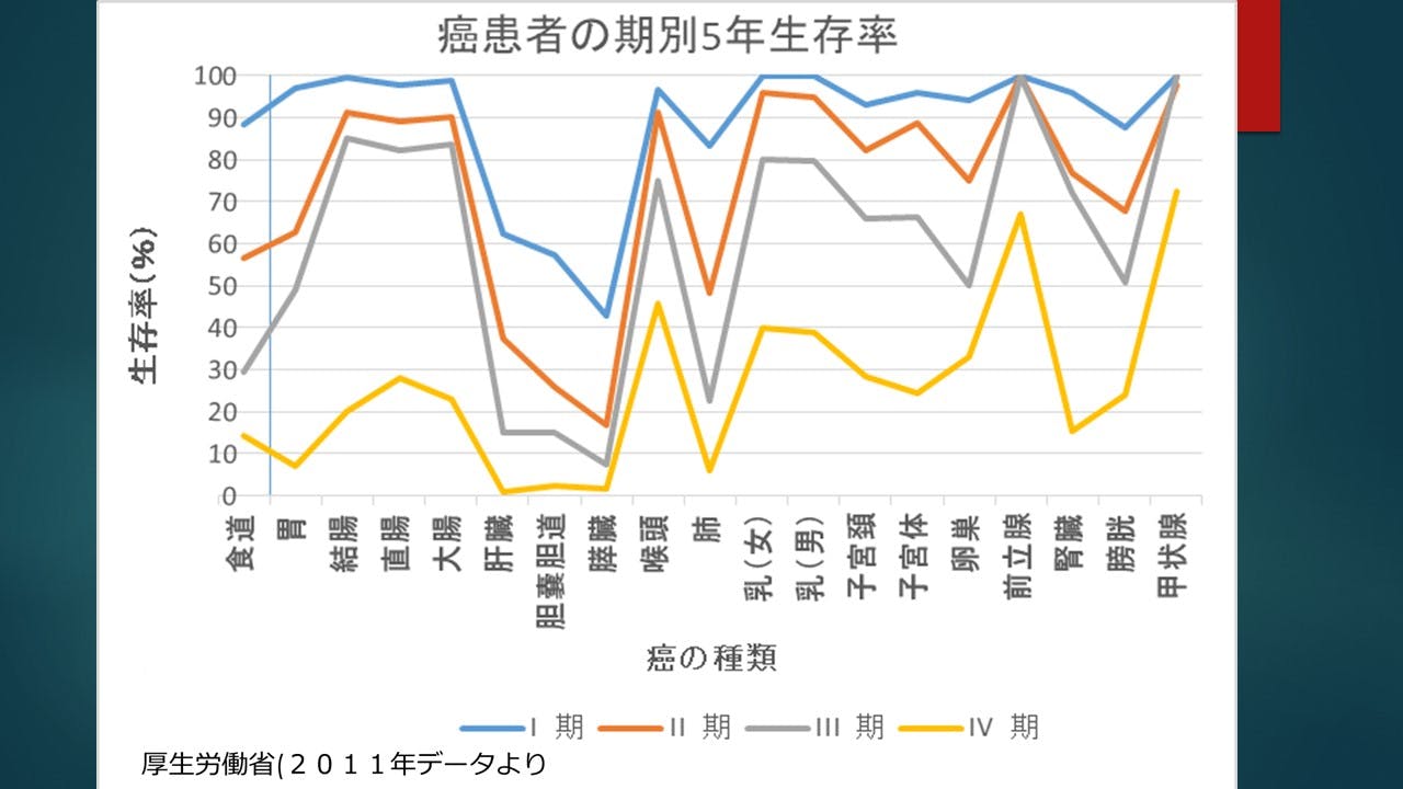 皆さん上の2つの図の青い線のところを見てください。青い線はI期で見つかった患者さんの生存率を示しています。I期で発見できると肝臓癌、胆嚢胆道癌、膵臓癌以外はほとんどが助かっていることがわかります。黄色はIV期の患者さんです。残念ながらほとんど助からないということが、この2つの図からわかりましたか。もっとわかりやすい図で見てみましょう。