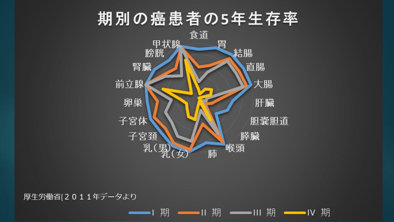 この図です。青い線は丸くなってます。肝臓と胆嚢胆道と膵臓は中へ入ってます。中心に近いほど死亡率が高く外に行くほど死亡率が低いことを示しています。この図を見ればわかるようにI期の患者さんは助けることができるのです。癌はI期で見つけなければいけないという事が皆さんわかっていただいたと思います。