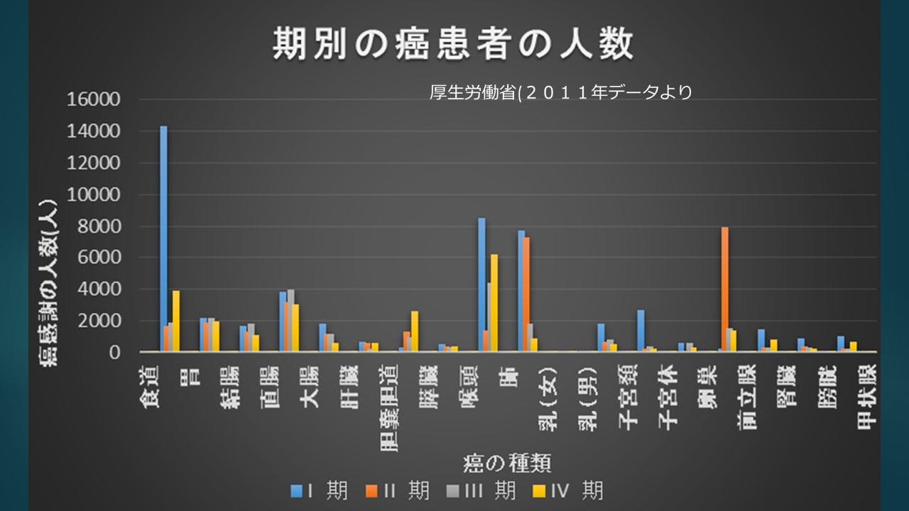 この図を見ていただければわかるように日本ではまだまだ癌の健康診断でI期で癌が見つかる人は人は少ないのです。I期で多く見つかっているのは胃癌と肺がんと乳癌と子宮がんくらいなのです。でも肺癌もIV期で見つかっている方は多いです。膵臓癌に至ってはIV期で見つかる方が一番多いのです。