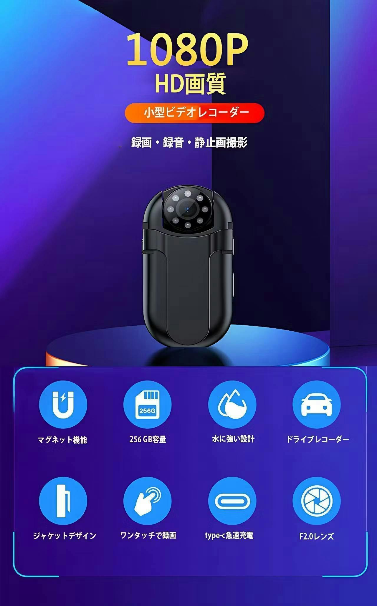 本体はコンパクトですが、アクションカメラにも負けない最大1080PのフルHDの高画質録画に対応しており、映像を超鮮明に記録できます。