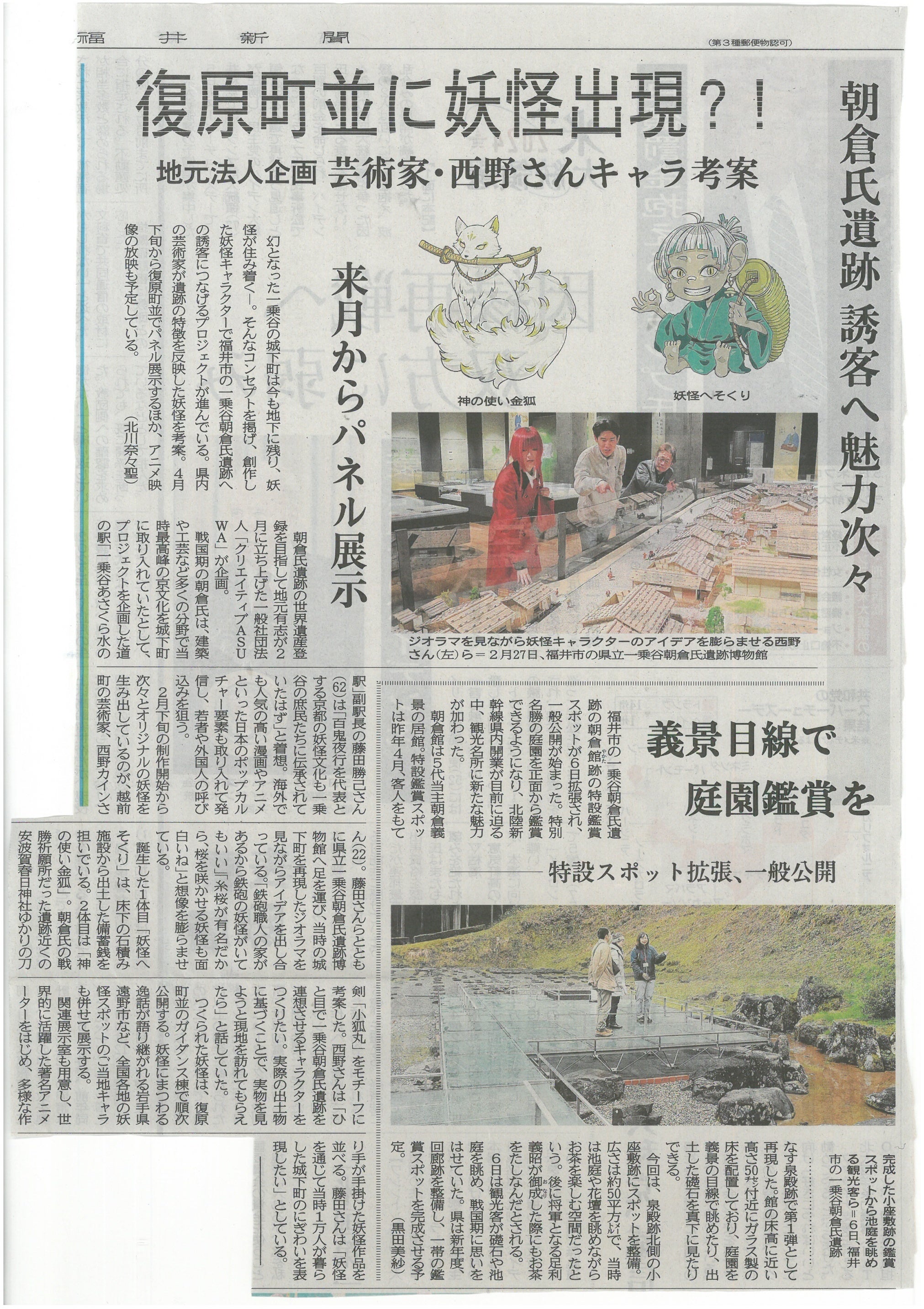 既にモデルとなる妖怪12点を地元アーティスト西野カイン氏(22歳)によりデザイン制作。一乗谷朝倉氏遺跡内の復原武家屋敷・管理棟展示室にて一般公開を開始。