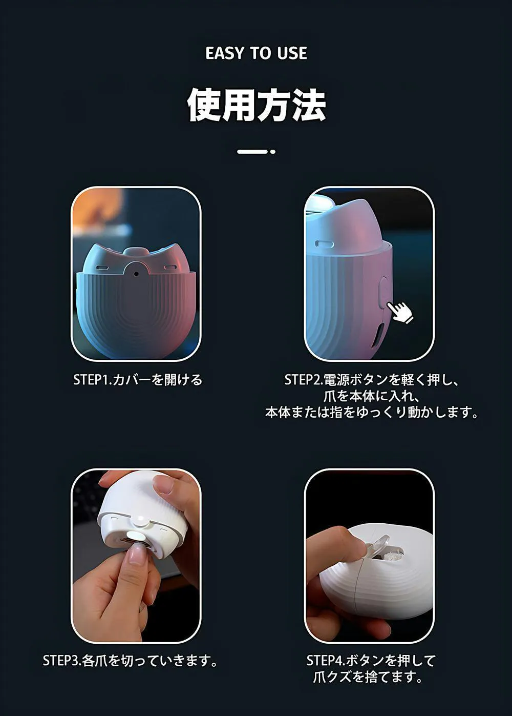 ボタンを軽く押すだけで爪クズを簡単に取り出せます。