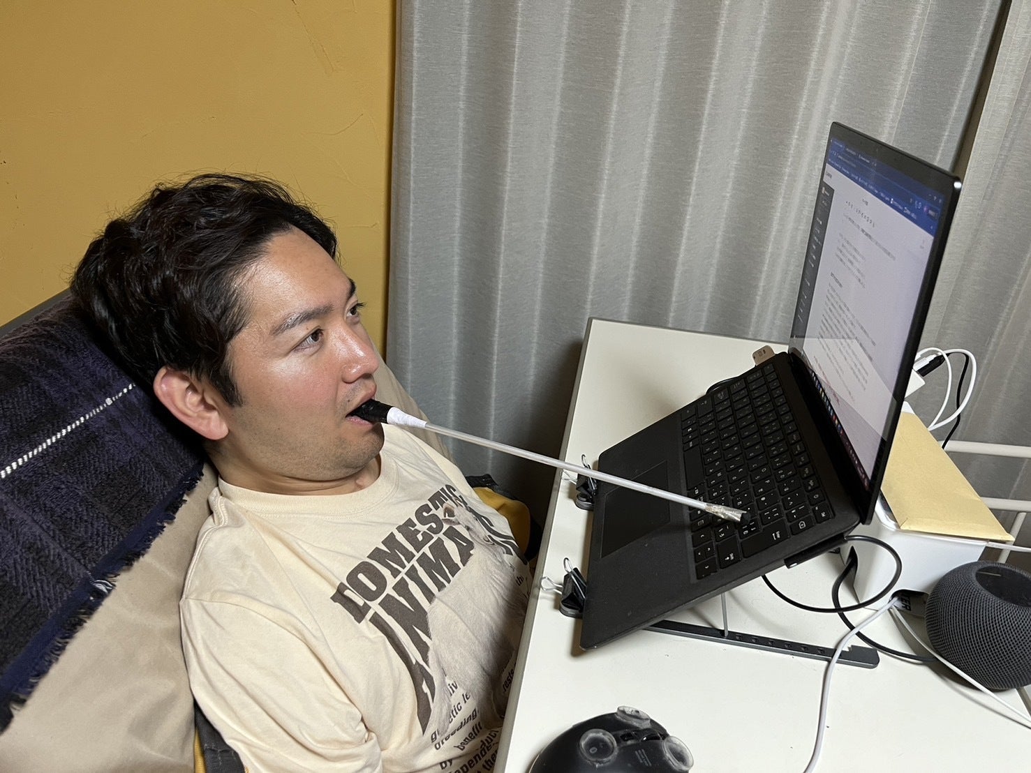 手足が動かなくても、口に棒をくわえてパソコンやスマホを操作できるようになり、あごで操作できる電動車椅子に乗って自由に移動することもできるようになりました。