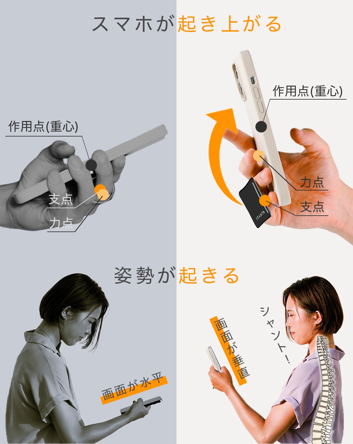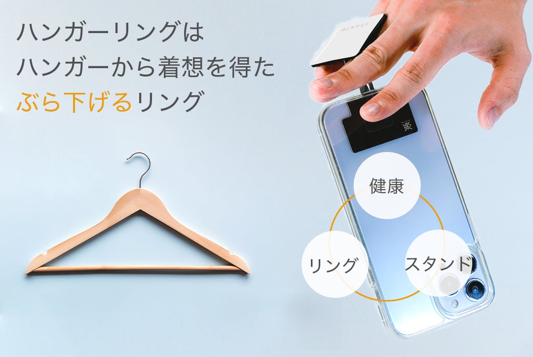 SYANTOは『ハンガーリング』というぶら下げる対応のスマホガジェットです。ハンガーから着想を得ており、従来の背面に取り付けるタイプのスマホリングとは異なり、底面に取り付けることで支点・力点・作用点の位置関係が変化し、スマホが垂直に立ちやすくなります