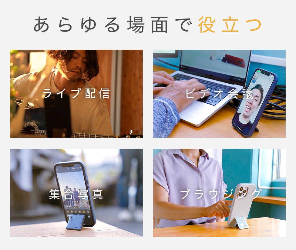 変形いらずの「0秒スタンド」で操作らくらく。アウトカメラのスタンドで自撮りでも大活躍。