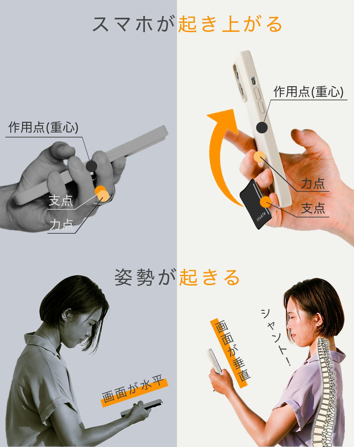 SYANTOは『ハンガーリング』というぶら下げる対応のスマホガジェットです。ハンガーから着想を得ており、従来の背面に取り付けるタイプのスマホリングとは異なり、底面に取り付けることで支点・力点・作用点の位置関係が変化し、スマホが垂直に立ちやすくなります。