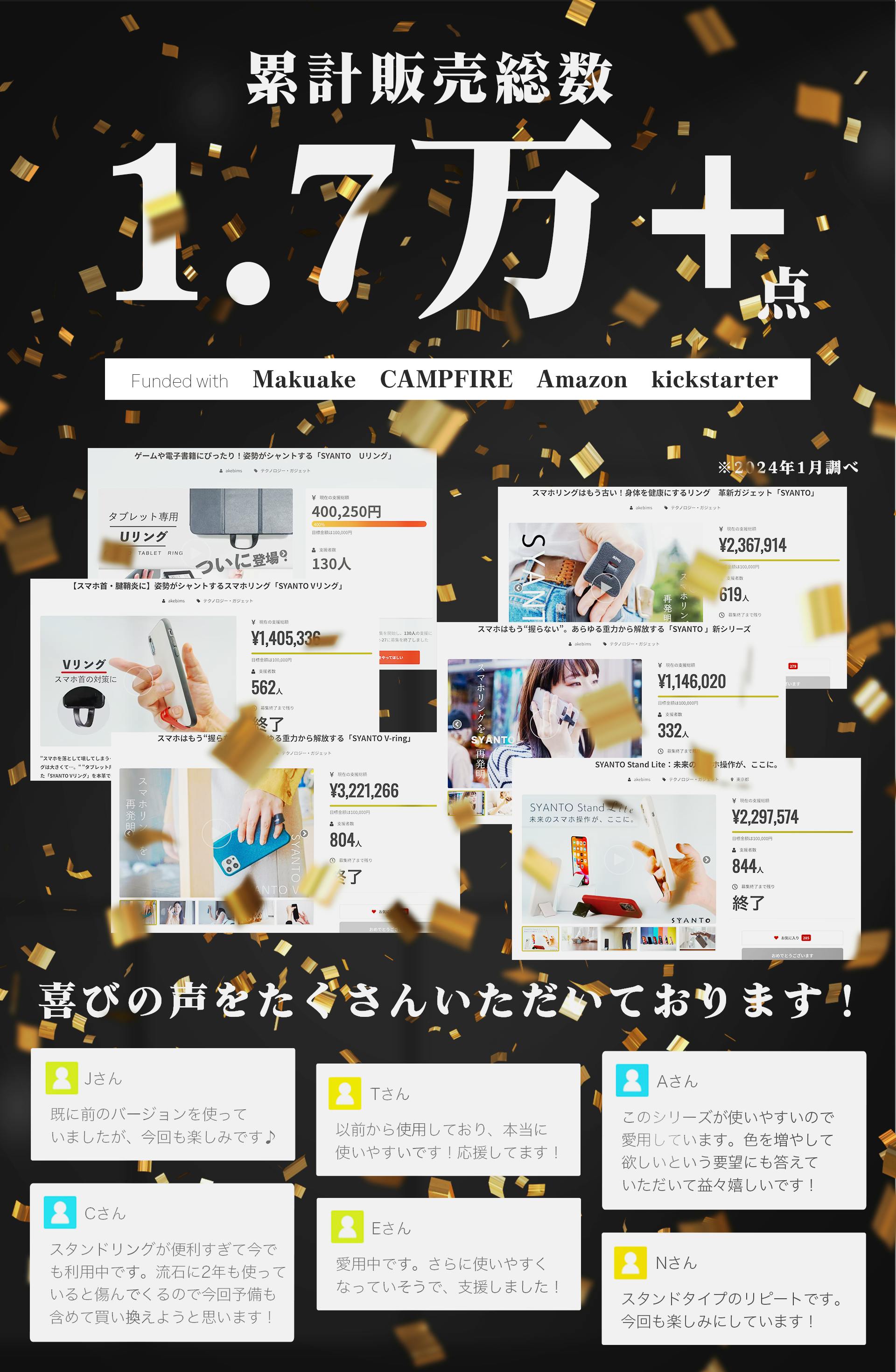 SYANTOはこれまでにMakuake、CAMPFIRE、米国kickstarter、Amazonで累計1.7万人以上の方から支援をいただき、多くの方のスマホ操作の悩み解決に貢献してきました。