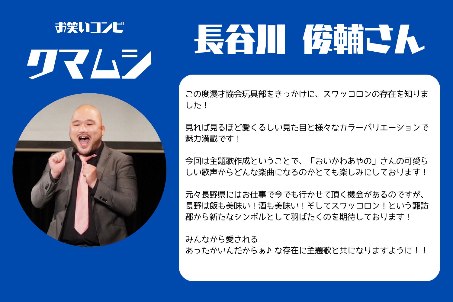 この主題歌を通じて、スワッコロンとともに諏訪湖の魅力も多くの人に知ってもらい、地域の活性化に貢献していきたいです!