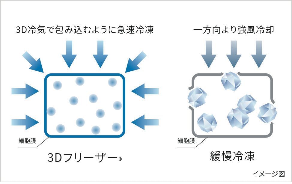 専用の3D冷凍技術で食品の美味しさを維持したまま急速冷凍。