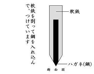 切れ味の秘訣は2つあり、割り込みと言われる複合材による構造と水焼き入れにあります。割り込みとは、一つの鉄の中心に違う鉄を挟み込むことを言います。硬くてもろい鋼をしなやかな軟鉄で挟み込むことで、強靭さをしなやかさを併せ持つ複合材が出来上がります。こうすることで実際物を切る刃の部分は硬い鋼が研ぎ出すことで出てきます。メンテナンスの際も硬い刃は少しだけ研ぐだけでいいので取り扱いし易い包丁となります。切れ味に重要な挟み込まれた鋼は安来鋼青紙2号を使用しております。