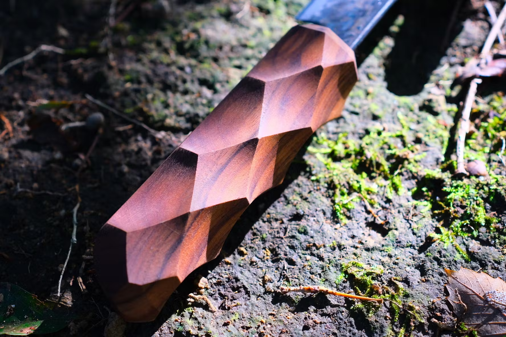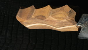 そしてその包丁のハンドルは、北海道の木工工房の凪Factoryの名栗ハンドル。日本の伝統工芸、名栗技法により世界三大銘木のウォールナット材を削り出し成形したものです。この2つが融合した他に類を見ない包丁が完成しました!