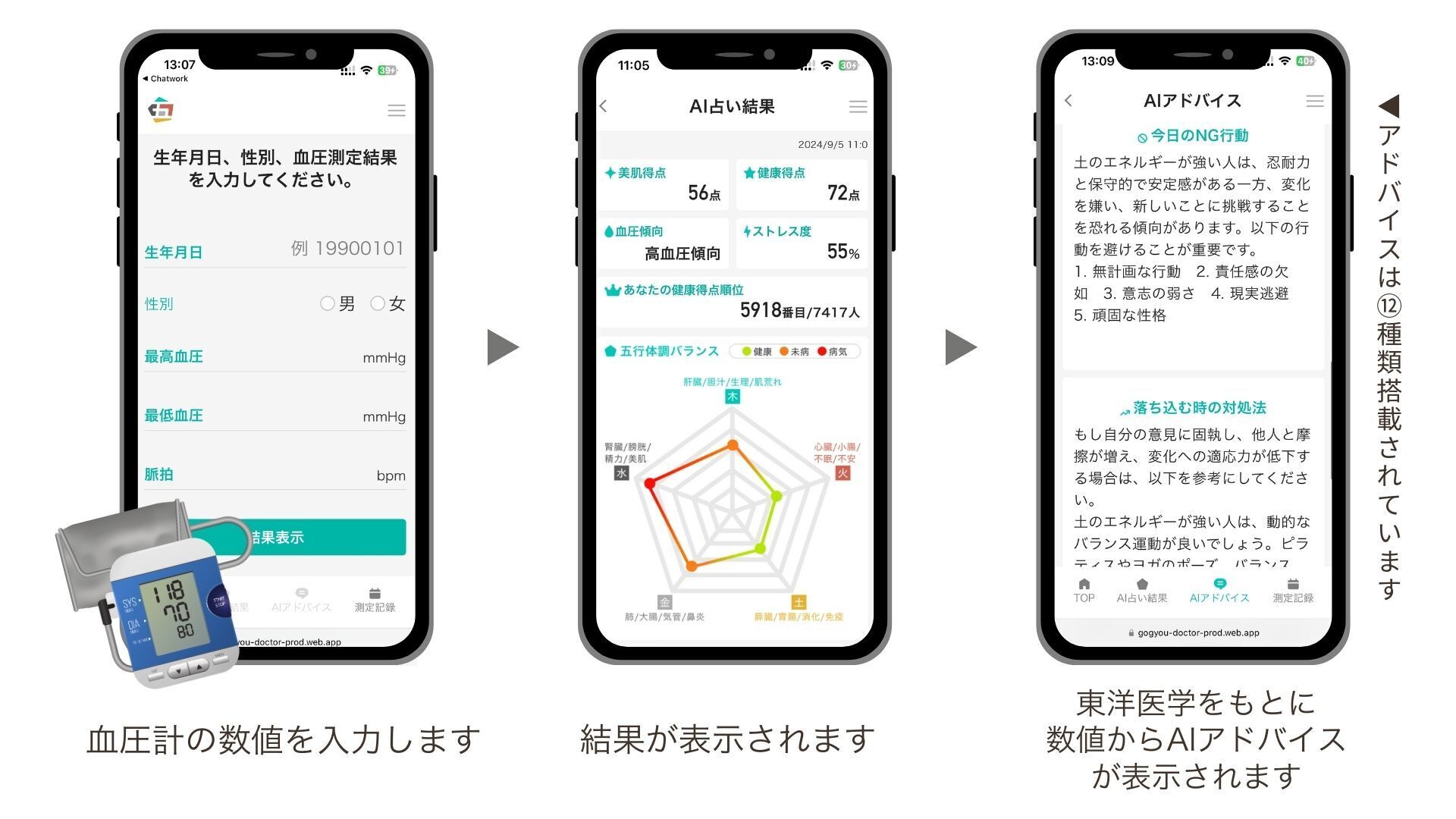 五行ドクターは血圧計があればいつでもどこでも利用できます。①血圧測定をする②測定結果を画面に入力する③結果が出る④東洋医学をもとにAIが導き出したアドバイス結果が出る
