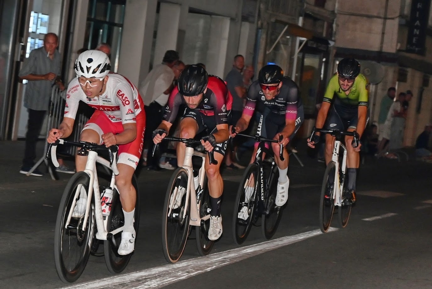 【RTA欧州遠征レポ(8月17日)】渡辺一気が完璧な勝利!チームも意気揚々で遠征は終盤戦へ。フランス自転車界の夏の風物詩と言えば、地域祭と併催されるナイトクリテリウム(ノクテュルヌ=ナイター)だ。日暮れ寸前にスタートし、レース中盤には完全な夜に。ここまで暗い中でのレースは初体験の選手も多く当初は戸惑いもあったが、すぐに適応。初戦で全員リタイアしたとは思えぬほどの活発さでレースをかき回す。レース終盤。地域の強豪選手による3名の逃げが決まったかと思いきや、集団に取り残された渡辺が急激な加速で逃げ集団に合流。勝負は4名に絞られる。ゴールスプリントでは渡辺が躊躇なく加速。スプリンターとされる選手を気迫で圧倒して勝利をもぎ取った。【レース情報】・レース名:La Nocturne de Montpont(ノクテュルヌ・ド・モンポン)・開催地:モンポン=ミネステロル・カテゴリー:オープン・距離:80.86km(1.47km x 55周)<リザルト>1位:渡辺 一気(U23/京都産業大学/2005年生)1時間47分422位:LARPE Killian(A.PO.GE CYCLISTE)3位:PEYENCET Mael(SPRINTER CLUB DU PERIGORD)10位:楠本 颯太(U23/オランダクラブチーム/2005年生)12位:林原 聖真(U23/明治大学/2003年生)22位:税所 蓮(U23/バルバハクサン&金沢工業大学o/2004年生)23位:風間 大和(U19/法政大学/2006年生)24位:辻 洸之介(U19/明治大学/2006年生)引き続き、8月末まで続く遠征で最大限の成果を残せるよう、RTA一同全力を尽くしますので、応援のほどよろしくお願い申し上げます。【参考リンク】RTAロード・トゥ・ラヴニール2024年夏期欧州遠征について