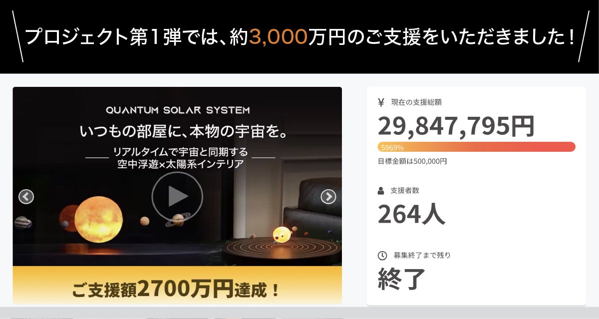 2024/08/01 12:00ご支援者様、沢山の応援、ご支援ありがとうございました。最終的に目標「4812%」、ご支援額「4,812,643円」を達成し、「196人」のたくさんのご支援者様を募ることができました!前回プロジェクトQuantum Solar Systemに続き、私たちの最新作Flaoting Worldsを知っていただけたことも、このプロジェクトの成果だと思っています。本プロジェクトの実施は、私たちの今後の日本進出への大きな一歩となる貴重な経験となりました。リターンの発送状況につきましては順次活動報告に掲載させて頂きます。また今後のことなども随時活動報告に掲載させて頂きたいと思います。改めて、この度は応援とご支援、誠にありがとうございました。たくさんの「応援コメント」「メッセージ」に励まされた約1ヶ月でした。公開期間が1ヶ月という、超爆速・期間限定プロジェクトではありましたが、たくさんの方のご支援で、想像以上の結果となりました。本当にありがとうございます。これからも「より宇宙が身近に感じられる製品」作りに邁進していきます!引き続き応援をよろしくお願いいたします!チーム一同 もっと見る