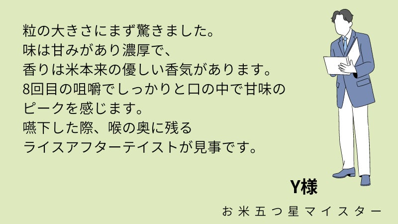 日本でお米の専門知識や技能を高く評価されたプロフェッショナル、お米五つ星マイスターのY様が、Tagosunふぁ~むのお米に、こんなコメントをくださいました。