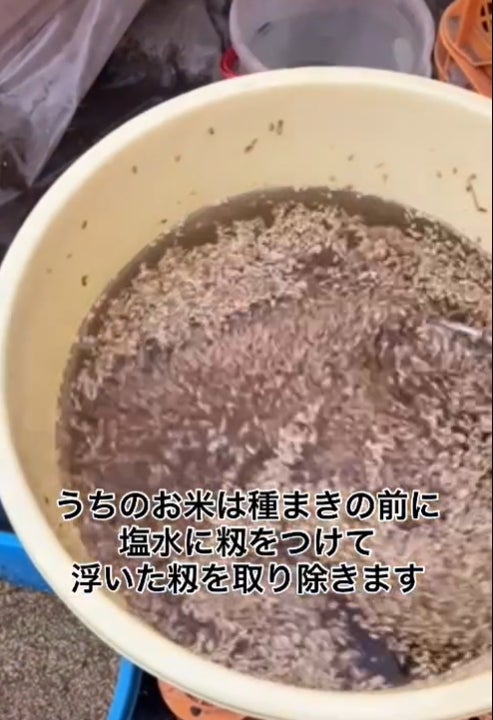 種となるお米を塩水につけていい種を選別します。身の締まったお米は沈み、逆に悪いお米は浮いてくるので、浮いたお米を取り除き残ったお米を種にすることで、土地や栽培方法にあった種を鍛えていくことができます!