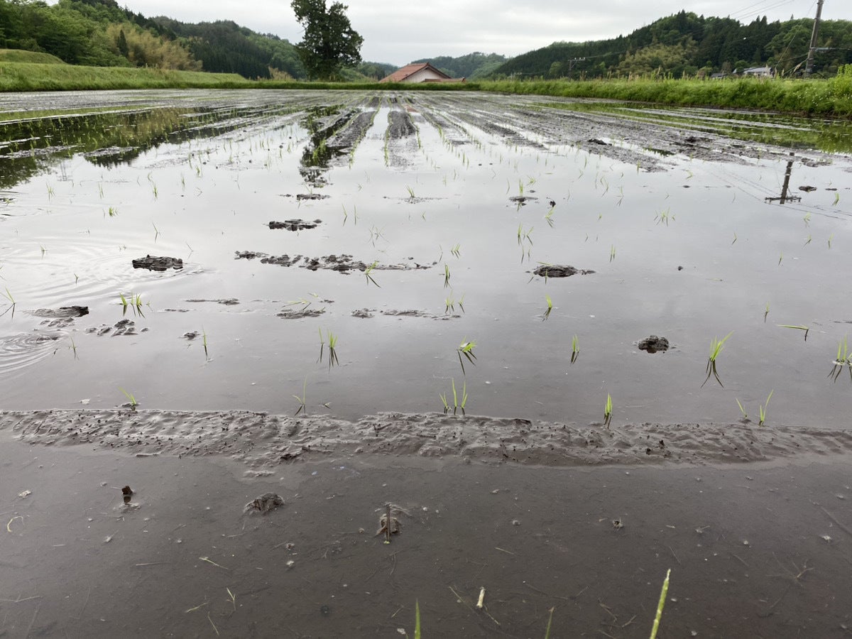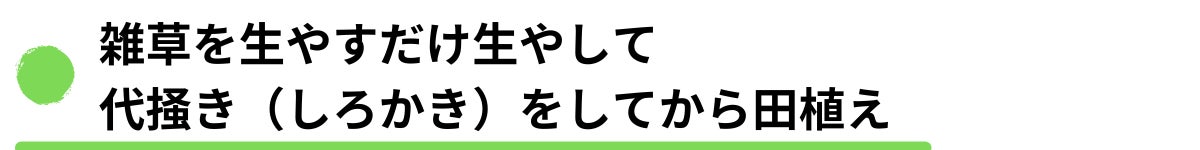 田植えを、一般的な時期よりも1カ月遅らせています。そのあいだ雑草を伸び放題にし、代掻き(土と水を均一に混ぜ合わせ、雑草の根を切断して土中に埋める)をします。このことにより、雑草の種を少しずつ減らすことができ、将来的に除草剤をさらに減らすことができる予定です。