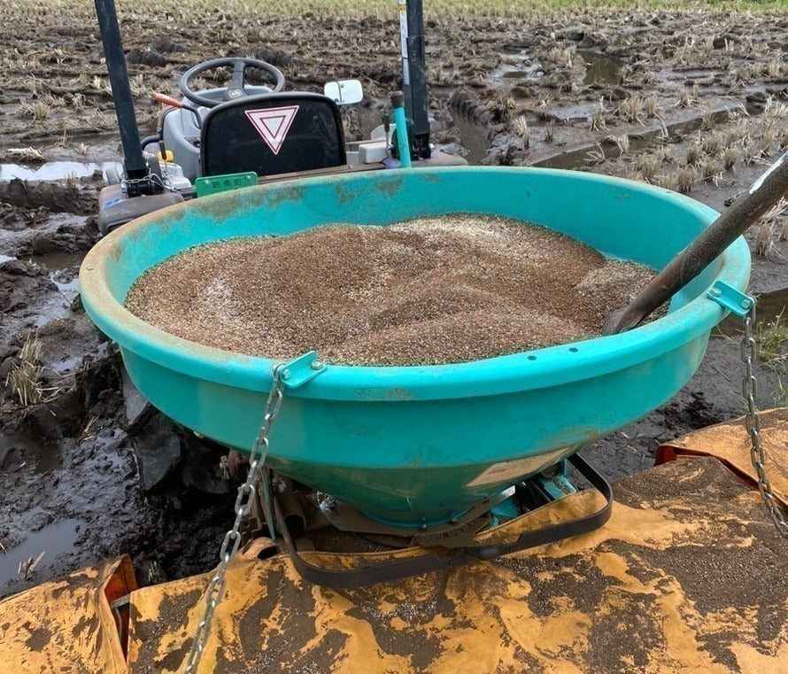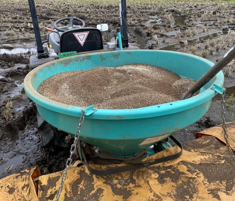春に、水をはる前の田んぼにオリジナル肥料を撒いてトラクターで耕運します。この肥料は、稲わらを発酵させたものにウミドリのフンを混ぜ、ミネラル、鉄、カルシウムなどを補ったこだわりの有機肥料です。マイクロプラスティックの悪影響が心配な化学肥料は使いません。