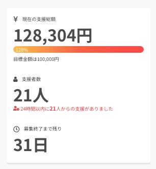 ご支援いただいた皆様、心から感謝申し上げます。開始からわずか20分で、目標金額を100%達成することができました!ネクストゴールとして、30万円、50万円と目標を上げて1ヶ月間、改善し続けて参ります。まずはご支援いただいた皆様に、しっかりと価値をお届けできるよう精進いたします!今後ともよろしくお願いいたします!