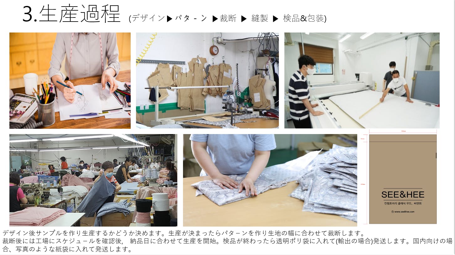 デザイン後、サンプルを作り生産するかを決めます。生産が決まったらパターンを作り、生地の幅に合わせて裁断します。裁断後には工場にスケジュールを確認後、納品日に合わせて生産を開始。検品が終わったら国内への出荷を開始します。