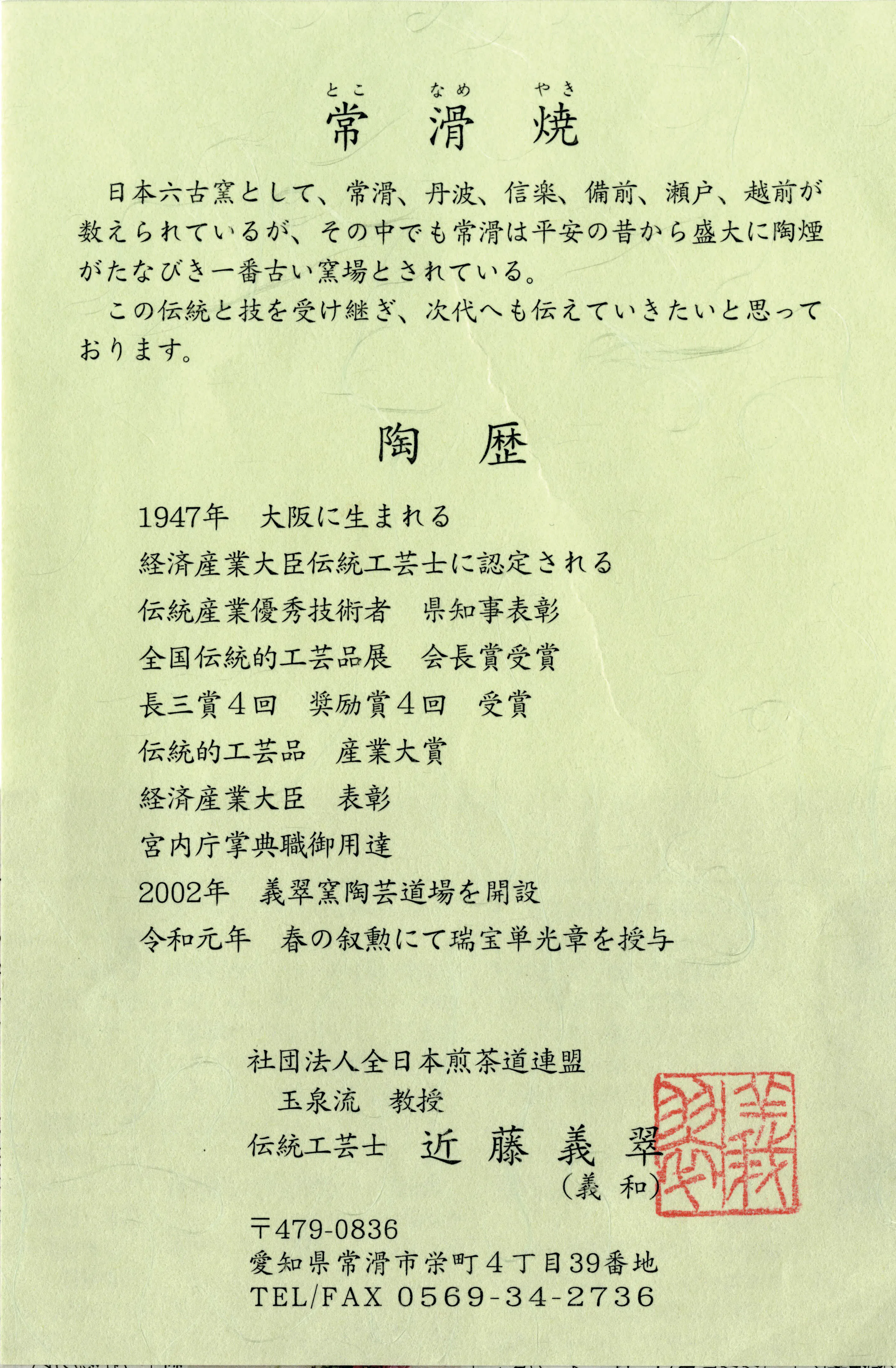 私は、常滑の観光地やきもの散歩道で「義翠窯 陶芸道場」を開いている伝統工芸士の近藤義和(義翠)です。