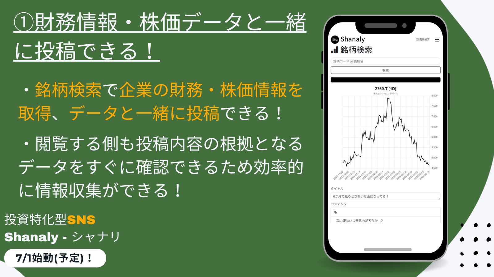 そこでたどり着いた結論が、「投資関連のトピックに特化したSNS」です。サービス名称は「Shanaly(シャナリ)」です。日々の学びや気づき、経験などを「シェア(Share)」し、財務情報や株価データなどを同時に「分析(analyze)」できる機能が一体となったサービスという思いで名づけました。