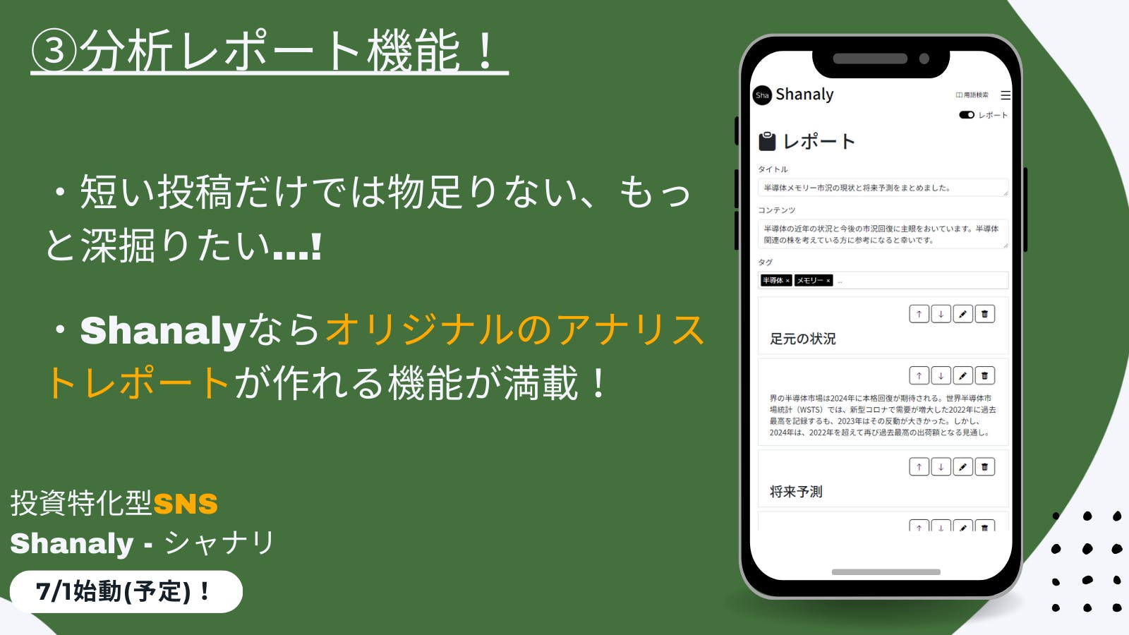 現在すでにSNS等で積極的に発信されている投資家の方もいらっしゃると思います。その日々の投稿をもっと充実させる新しい機能がShanaly(シャナリ)にはたくさん搭載されています!!