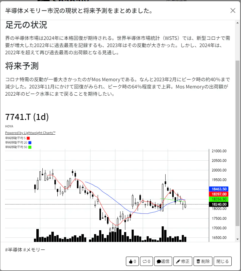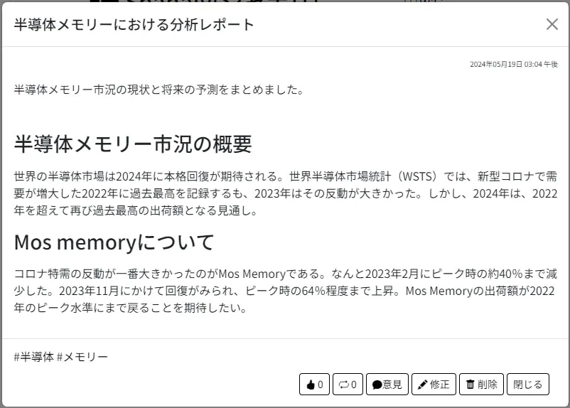 分析レポート機能では、投稿機能にはない長めの説明分や見出しの挿入、既存コンテンツの埋め込み、複数の財務データや株価情報も載せることができます。以下はオリジナルレポートの閲覧画面の一例です!