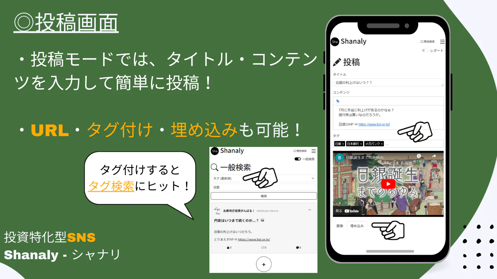 現在すでにSNS等で積極的に発信されている投資家の方もいらっしゃると思います。その日々の投稿をもっと充実させる新しい機能がShanaly(シャナリ)にはたくさん搭載されています!!