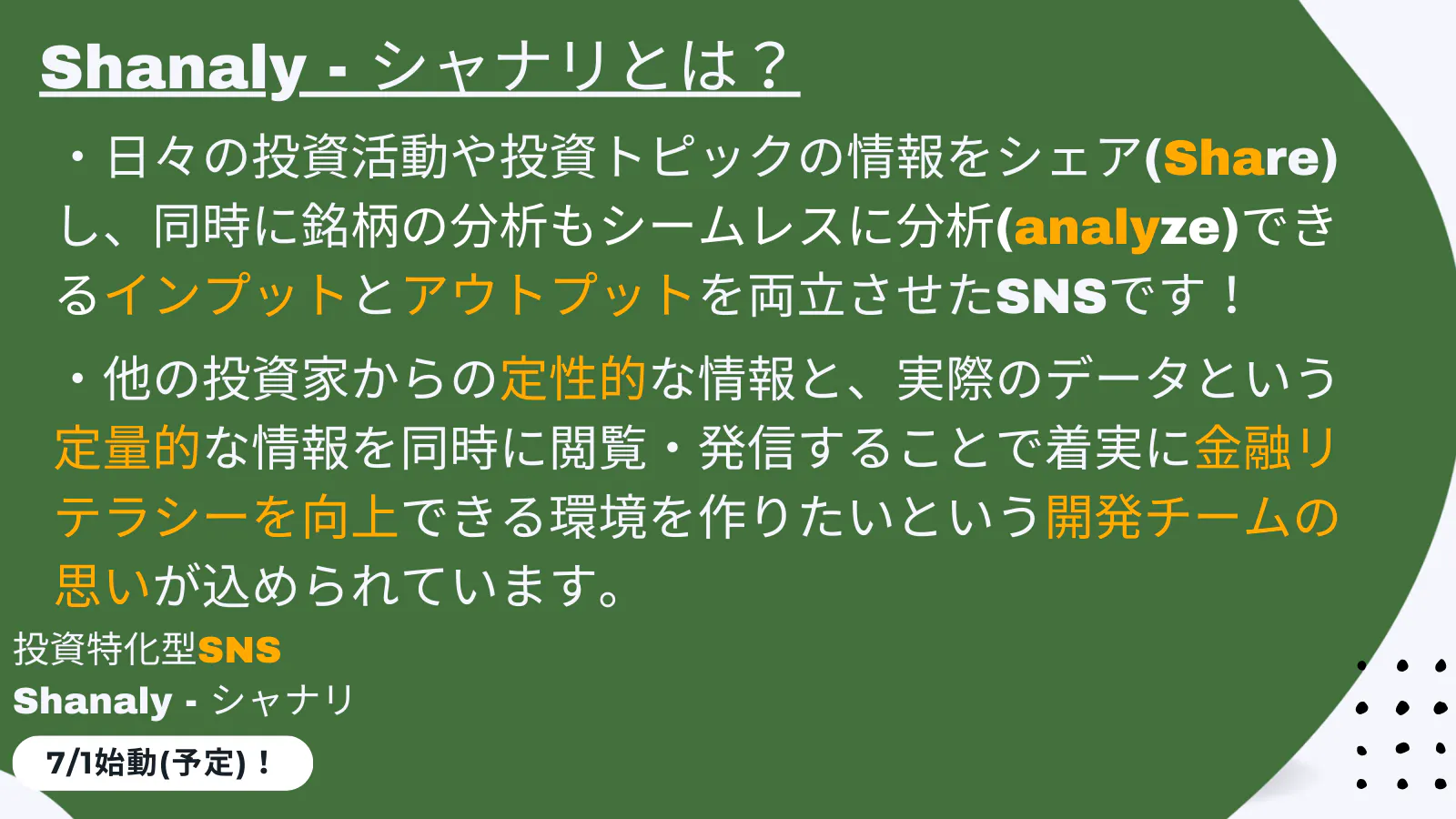みなさま、初めまして。投資特化型SNS[Shanaly(シャナリ)]開発チームです!