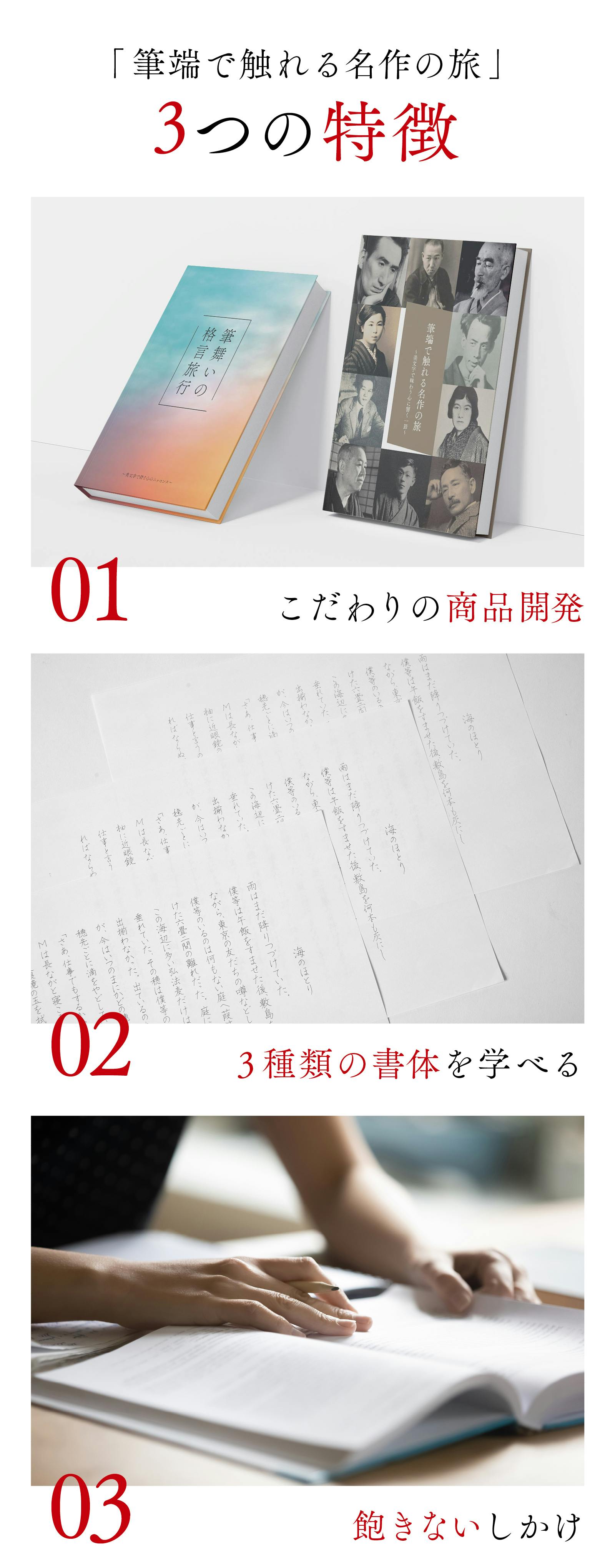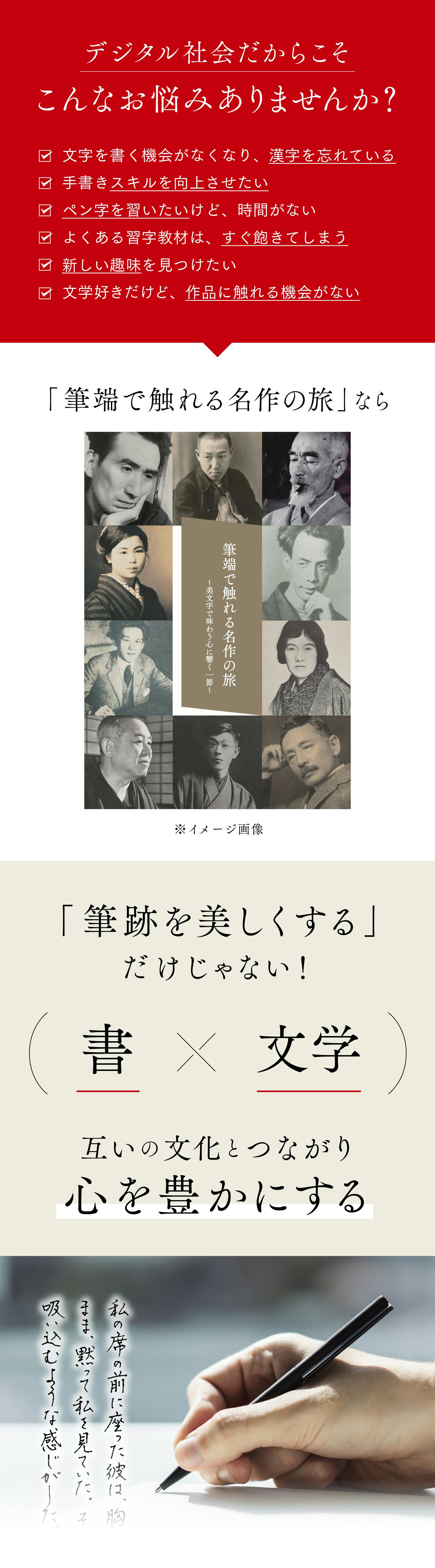 作家が綴った一節一節を書いて学ぶことで、単なるペン字の練習では味わえない、心の響きと深い感動を体感することが出来ます。