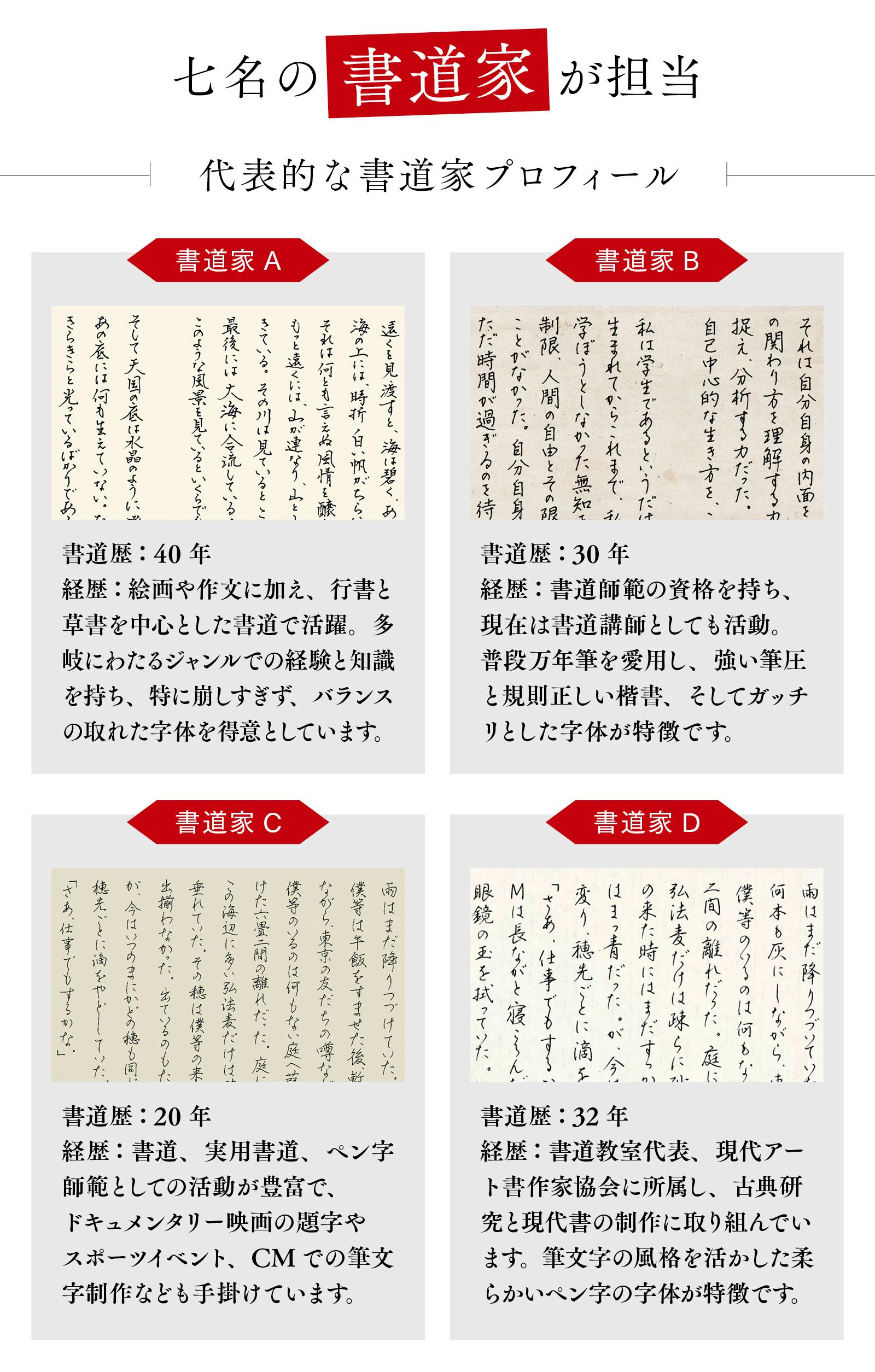 今回選出された7人の書道家たちは、筆文字に限らず、ペン字分野における楷書、行書、草書などの書体も深く知り尽くしたプロフェッショナルです。全員が書道の経験を20年以上積み、その分野において高い技術と知識を持ち合わせています。