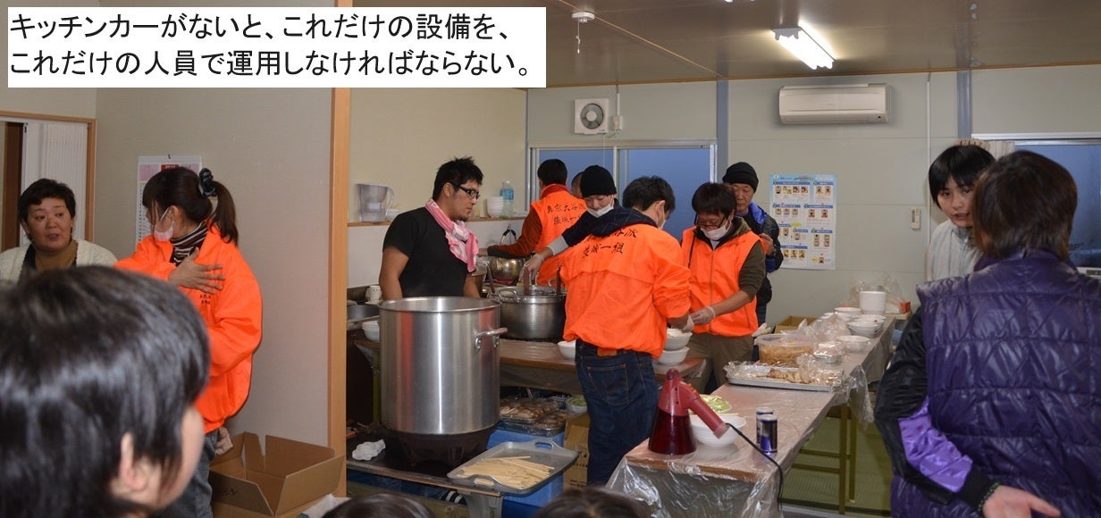 炊き出しに必要な炊事用具・電気・水すべてを兼ね備えたキッチンカーにより、少人数での活動が容易になり、またどんな場所でも短時間で準備が可能になり、より多くの温かい炊き出しが可能となりました。