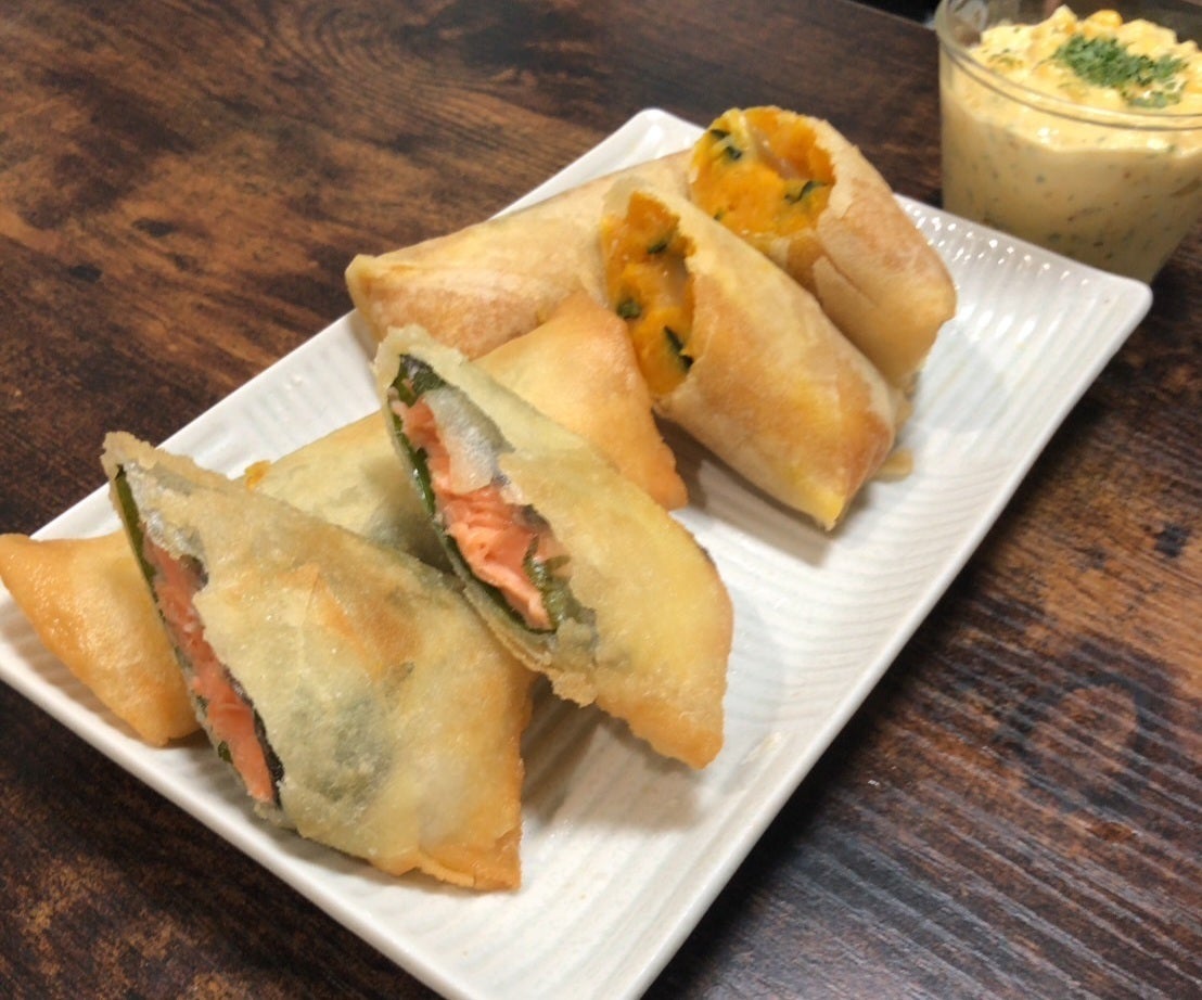 今の所4種類が餃子春巻き、五目春巻き、サーモン大葉チーズ春巻き、クリームポテト春巻きになります、私も春巻きに関してはそこまでの経験が少なく最初は包むのでさえ難しかったのですが、作る事にコツをつかんでいき、味にも自信があるものに仕上がってます。