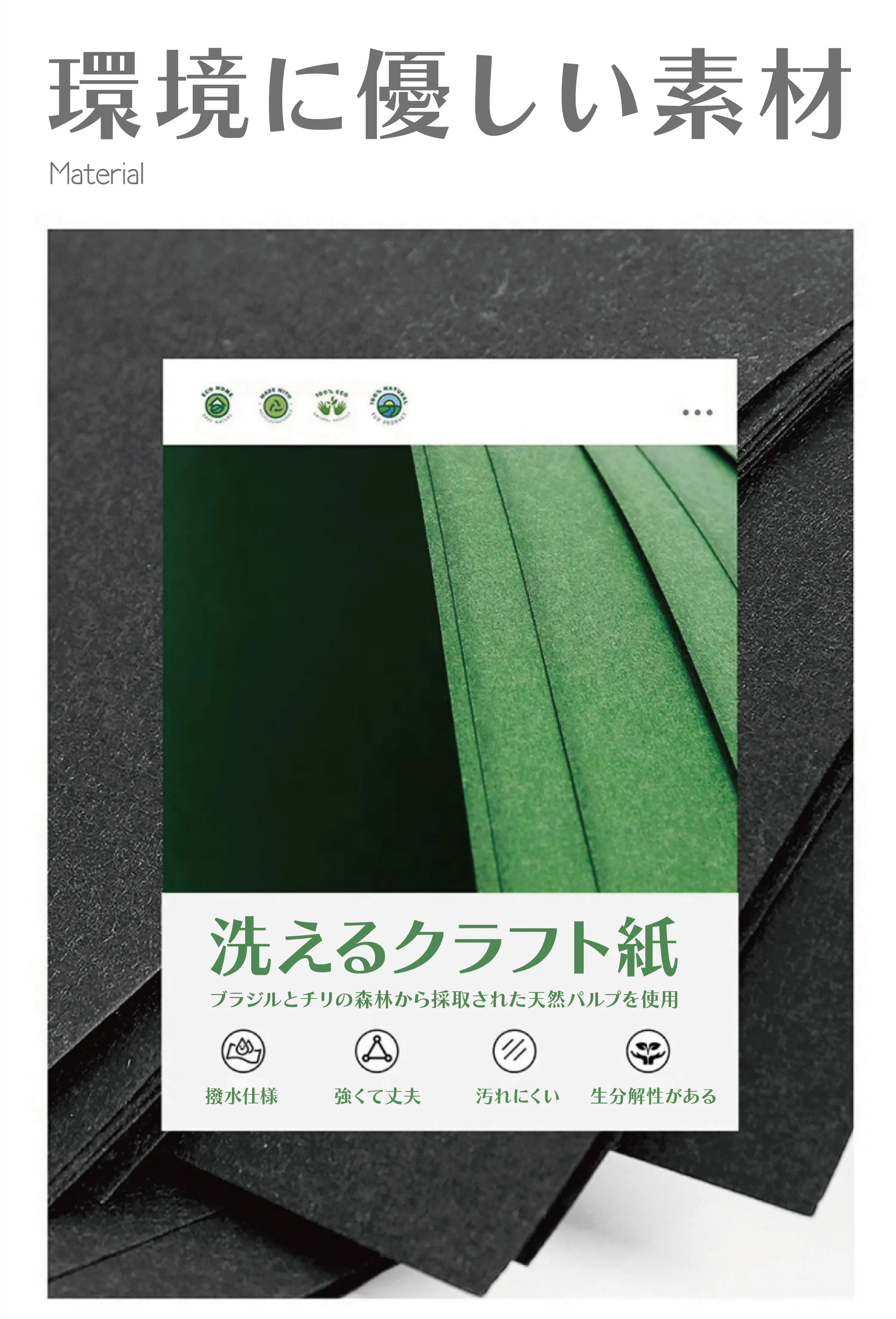 素材 : 洗えるクラフト紙、エコポンジー、デュポンSorona®ポリマー