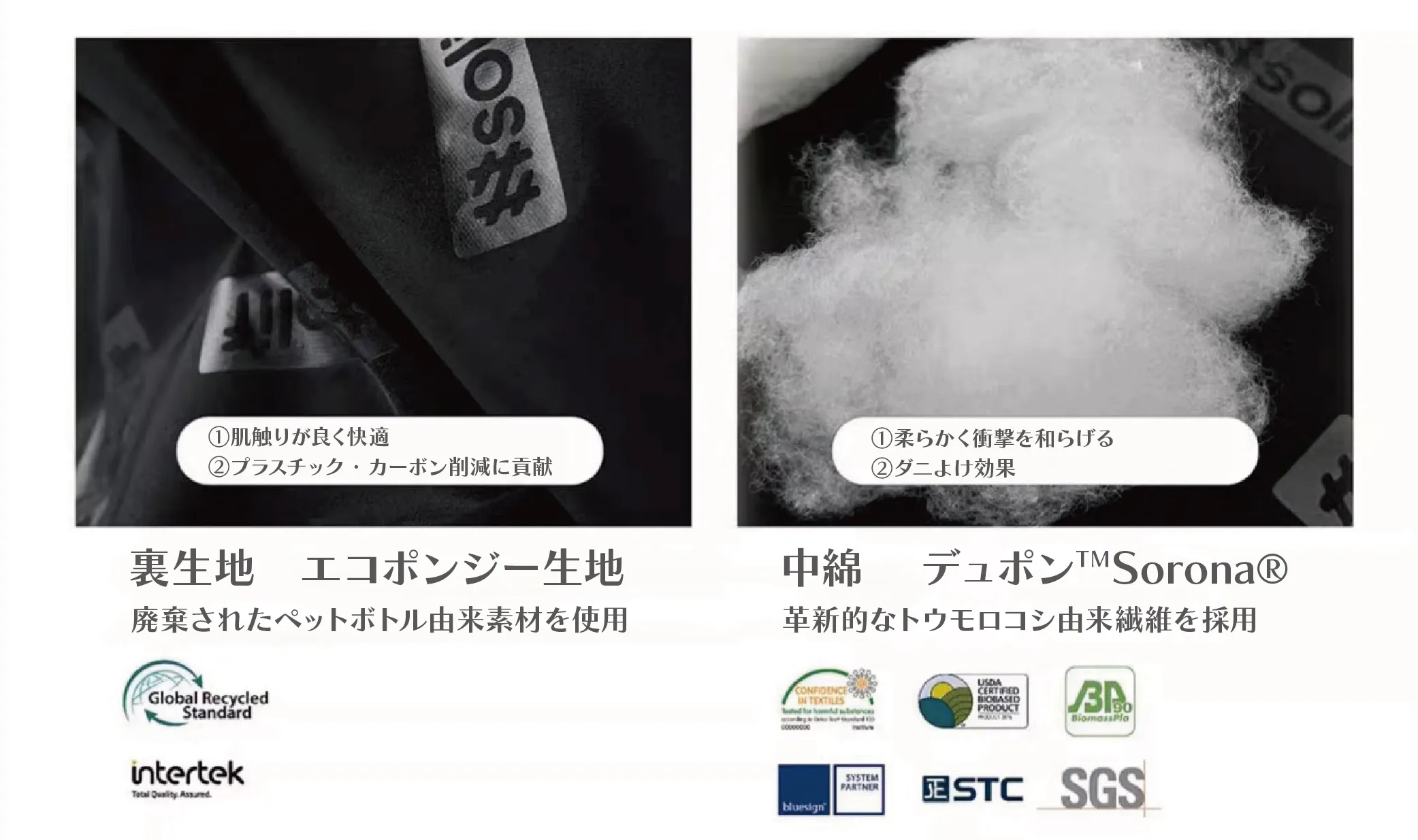 中綿はUSDA衛生性能基準準拠ガイドに基づき、エコテックス規格100製品分類にて認証された、米国デュポン社が開発した革新的なトウモロコシ由来繊維「Sorona® (ソロナ) ポリマー」を採用、
