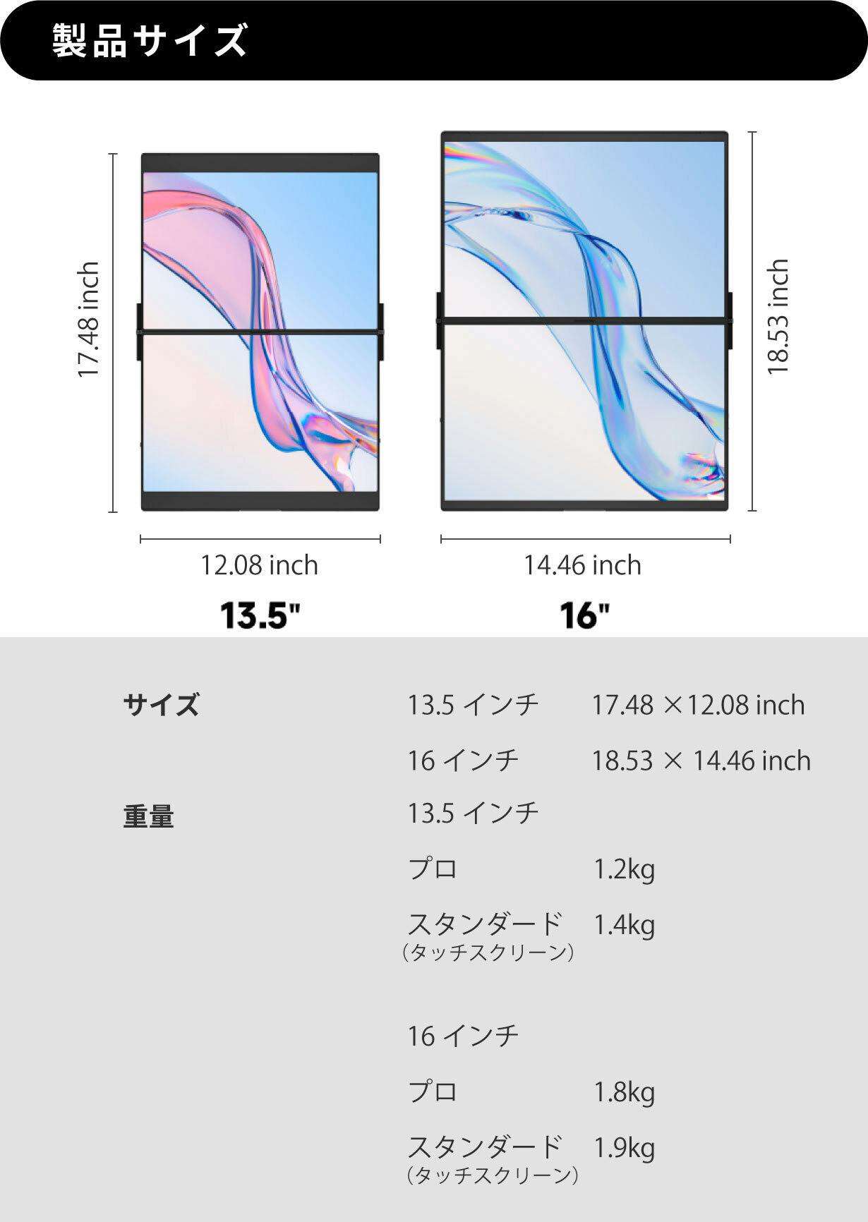 A: 13.5"の重量は約1.4kg、寸法は幅12.08 inch x 高さ17.48 inch x 厚さ16mm(折り畳んだ状態で最も厚い部分)です。 16"の重量は約1.9kg、寸法は幅14.46 inch x 高さ18.53 inch x 厚さ18mm(折り畳んだ状態で最も厚い部分)です。