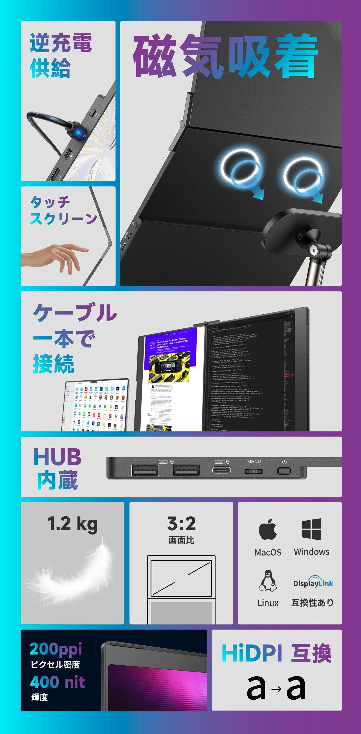 A: 13.5"は2256 × 1504(2.2K)、16"は2560 × 1600(2.5K)の解像度を提供します。