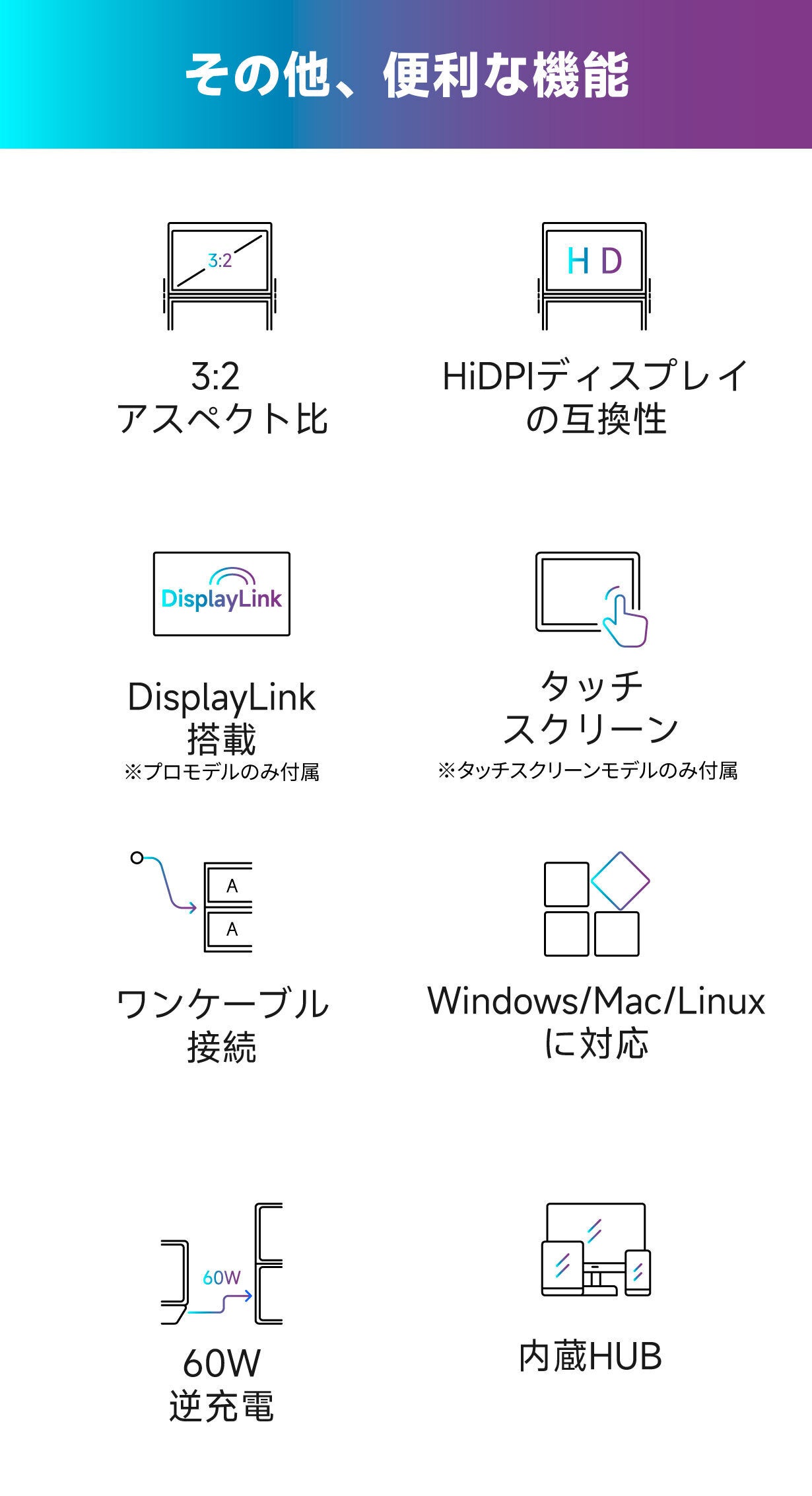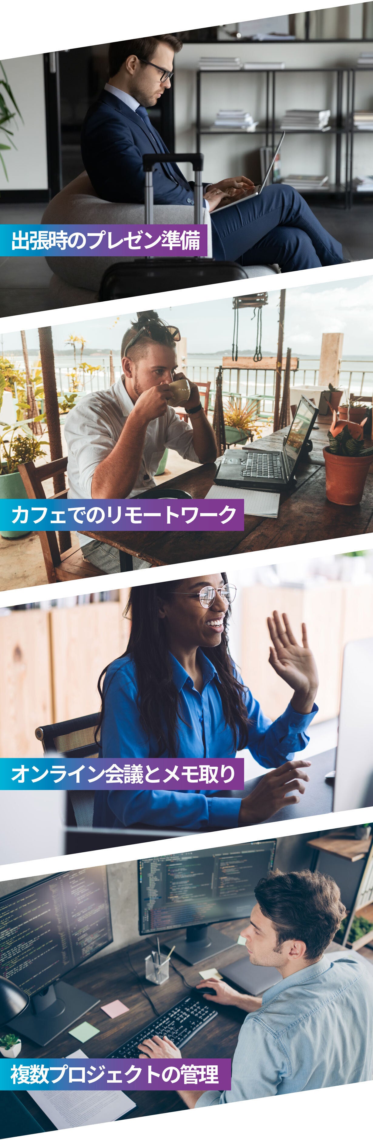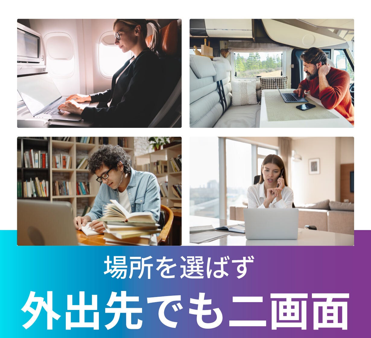 カフェ、電車、自宅など、場所を選ばずに二画面での作業が可能に。仕事もプライベートも、これ一つでスムーズです!
