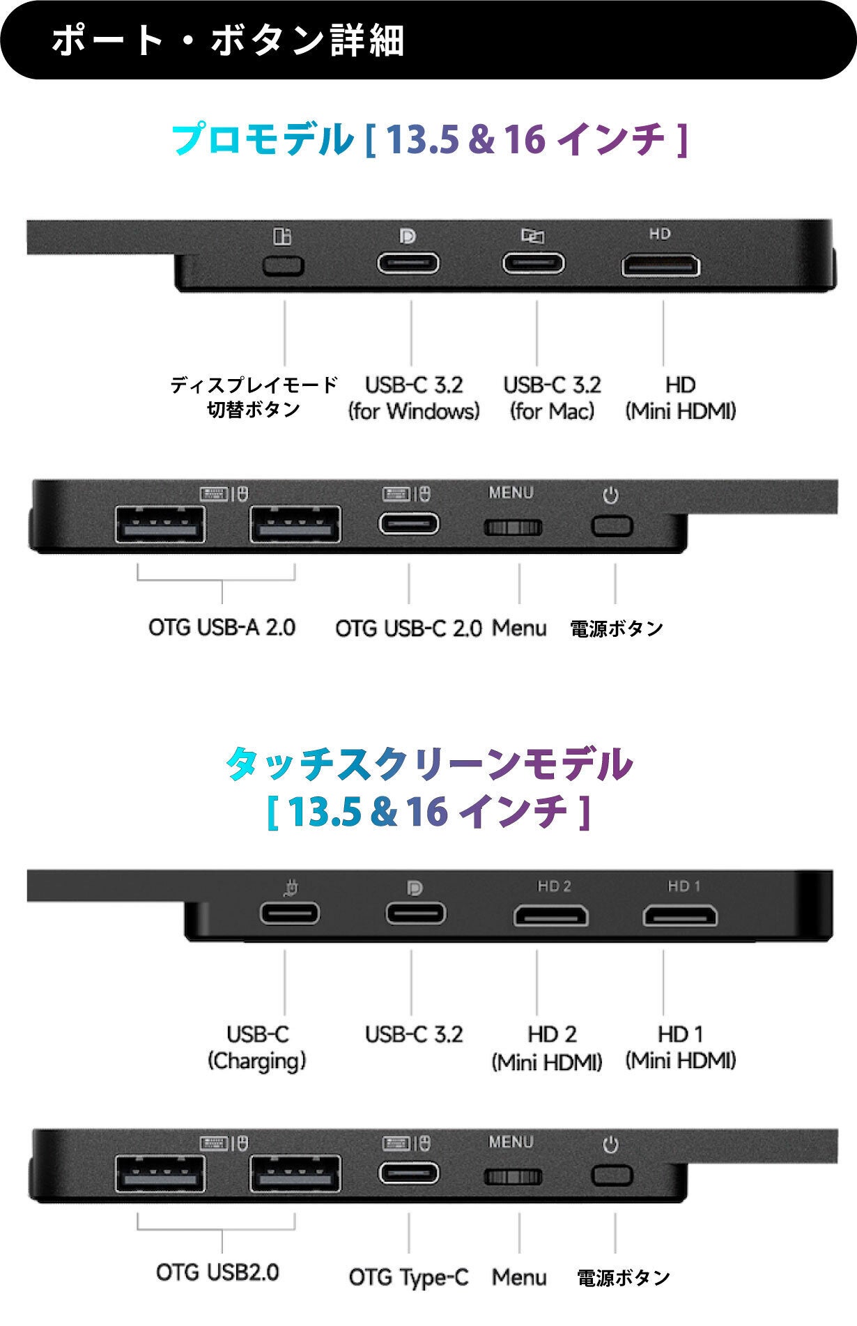 A: 13.5"は2256 × 1504(2.2K)、16"は2560 × 1600(2.5K)の解像度を提供します。