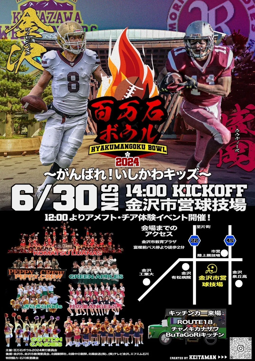 百万石ボウルの歴史は第1回が1995年、以降、毎年初夏のこの時期に開催し、途中、コロナ禍での中止があったものの今年で23回目を迎えることになります。石川県で唯一の社会人クラブチームの「金沢ワイセンベルグ」が他地域のチームを招待し、北陸でのアメフト普及を目的に開催しています。当日は、無料ゲームとし、更に試合前にはフィールドを開放、体験コーナーなど、アメフトを身近に感じていただけるよう工夫をしています。昨年からはキッチンカーも出店し、大いに盛り上がっています。