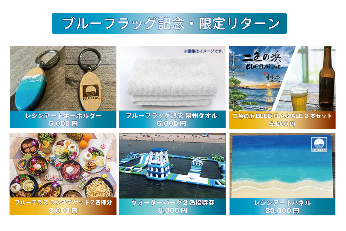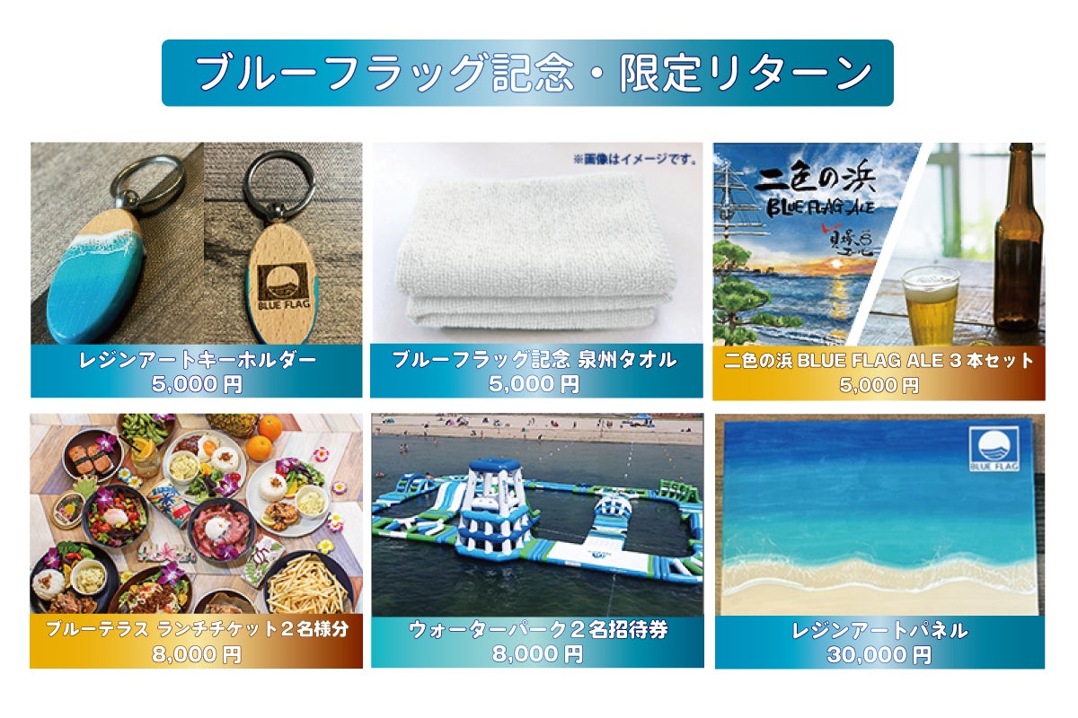 二色の浜をイメージしたデザインのレジンアートキーホルダーやオリジナル泉州タオルやクラフトビールなど今回のブルーフラッグ取得を記念したクラウドファンディング限定リターンを多数ご用意しました!